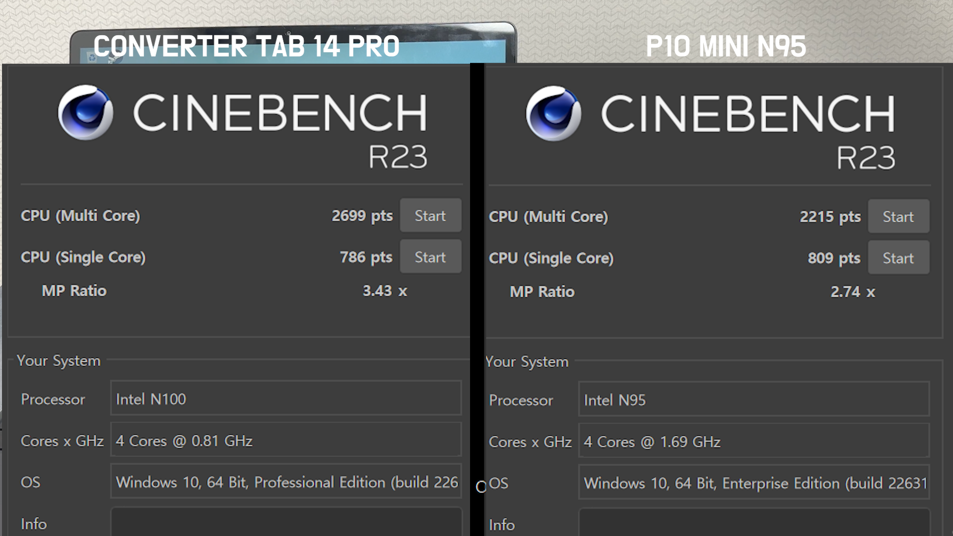 CINEBENCH R23 멀티 2699점, 싱글 786점 나왔는데 P10 mini 제품이 Inte N95를 사용하는데 싱글은 높지만 멀티는 컨버터 탭 14 프로 제품이 높게 나왔습니다.