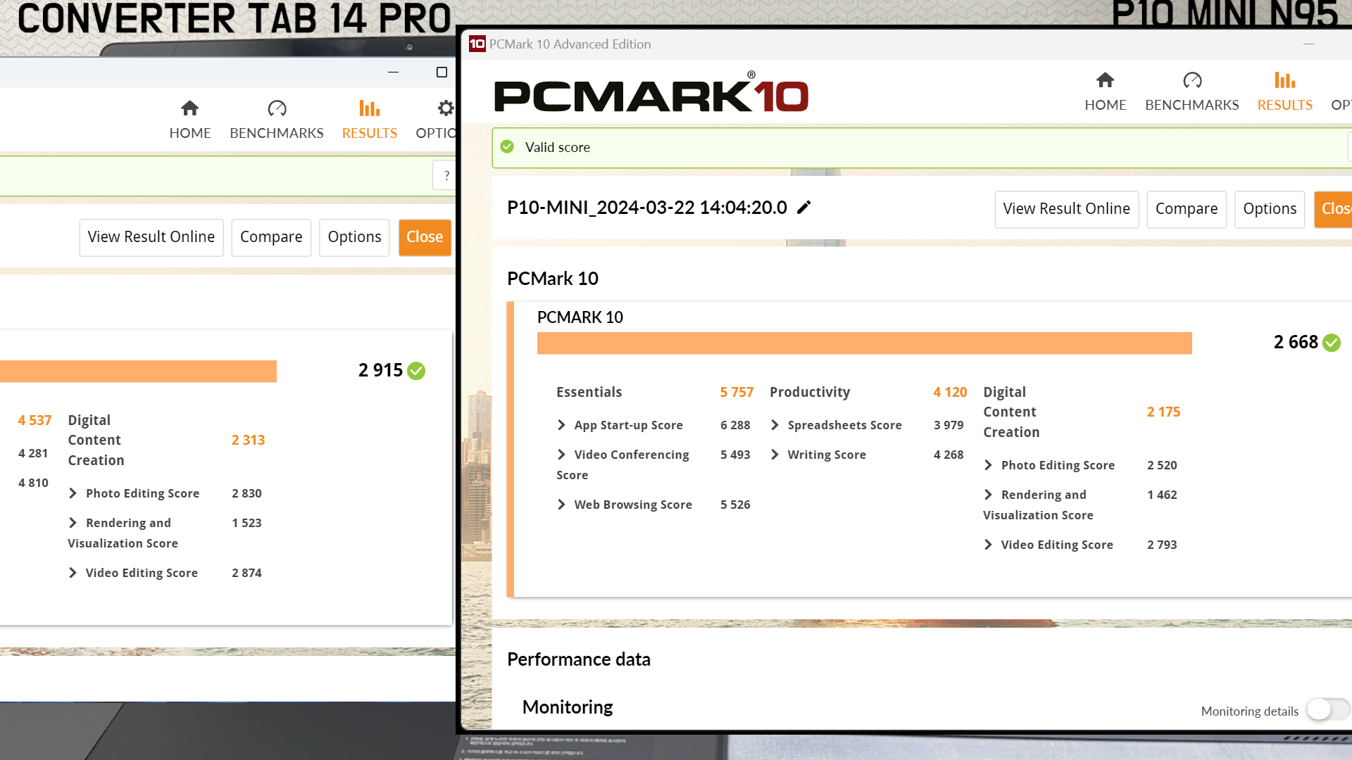 PCMARK 10으로 PC 실사용 환경에서 성능 체크를 진행했을 때 컨버터 탭 14 프로 제품이 2915점으로 실 사용에서는 N100 CPU 제품이 더 좋을 것 같습니다.
