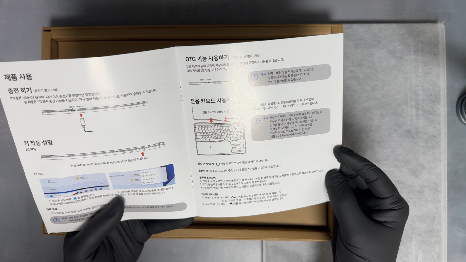 설명서에는 별매로 판매하는 전용 키보드 사용하는 방법도 나와있네요 충전기나 충전 케이블은 동봉되어 있지 않습니다. 충전기는 30W 이상을 지원하는 PD 충전기를 사용하면 됩니다.