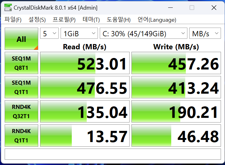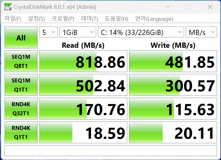 CrystalDiskMark 8 - 아이뮤즈 컨버터 탭 14 프로 읽기 818점, 쓰기 481점 나왔고. P10 mini 읽기 523점, 쓰기 457점 나왔습니다.