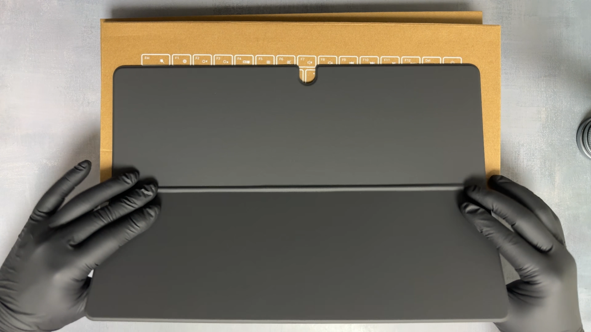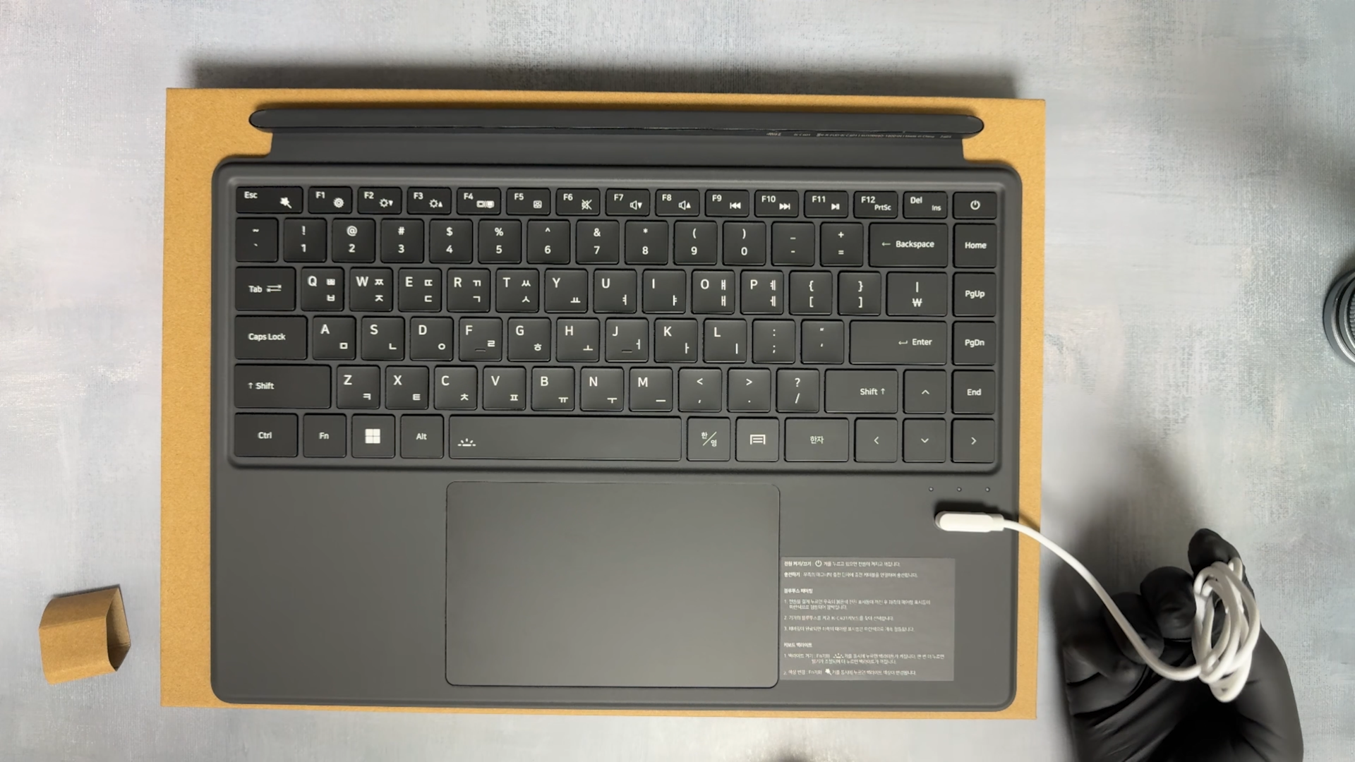 이 제품은 블루투스 연결 키보드입니다. 키보드 안에 충전 케이블이 동봉되어 있고, 마그네틱 방식에 USB-C Type입니다. 키보드 충전은 오른쪽 포고핀을 이용합니다. 키보드는 키감도 쫀득하고요 터치패드 크기가 상당히 커서 사용하는데 불편함이 없을 것 같습니다.