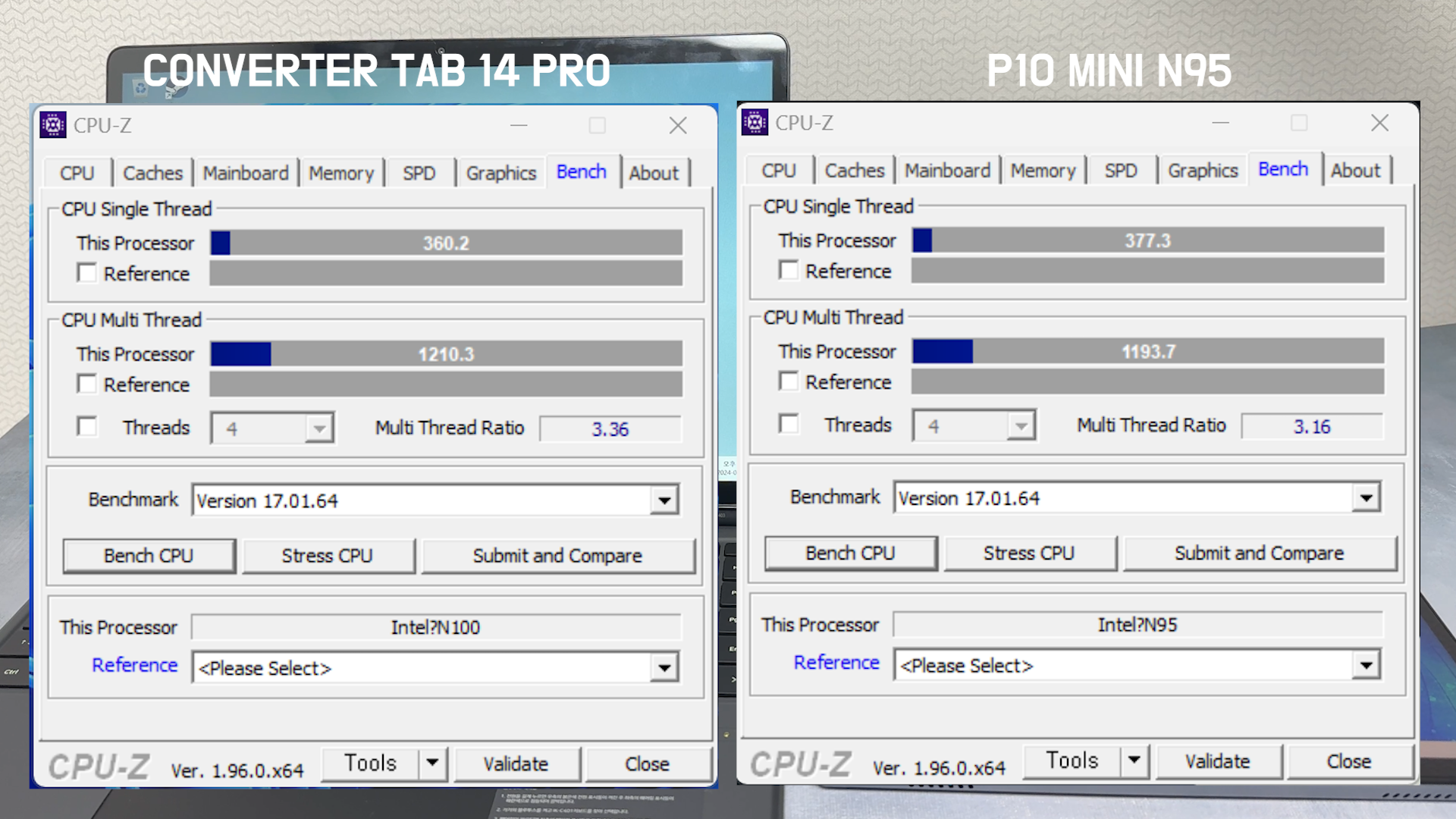 CPU-Z 프로그램으로 최고 성능 모드에서 CPU 성능 측정 결과 싱글 360점, 멀티 1210점 나왔습니다. 역시 멀티는 컨버터 탭 14 프로 제품이 높게 나왔고 싱글은 P10 mini 제품이 높게 나왔습니다.