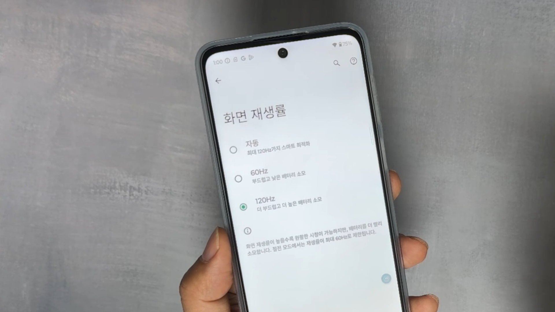전원을 켜면 모토로라 특유의 부팅 소리가 들리고요 전면 배젤은 하단이 더 넓습니다.