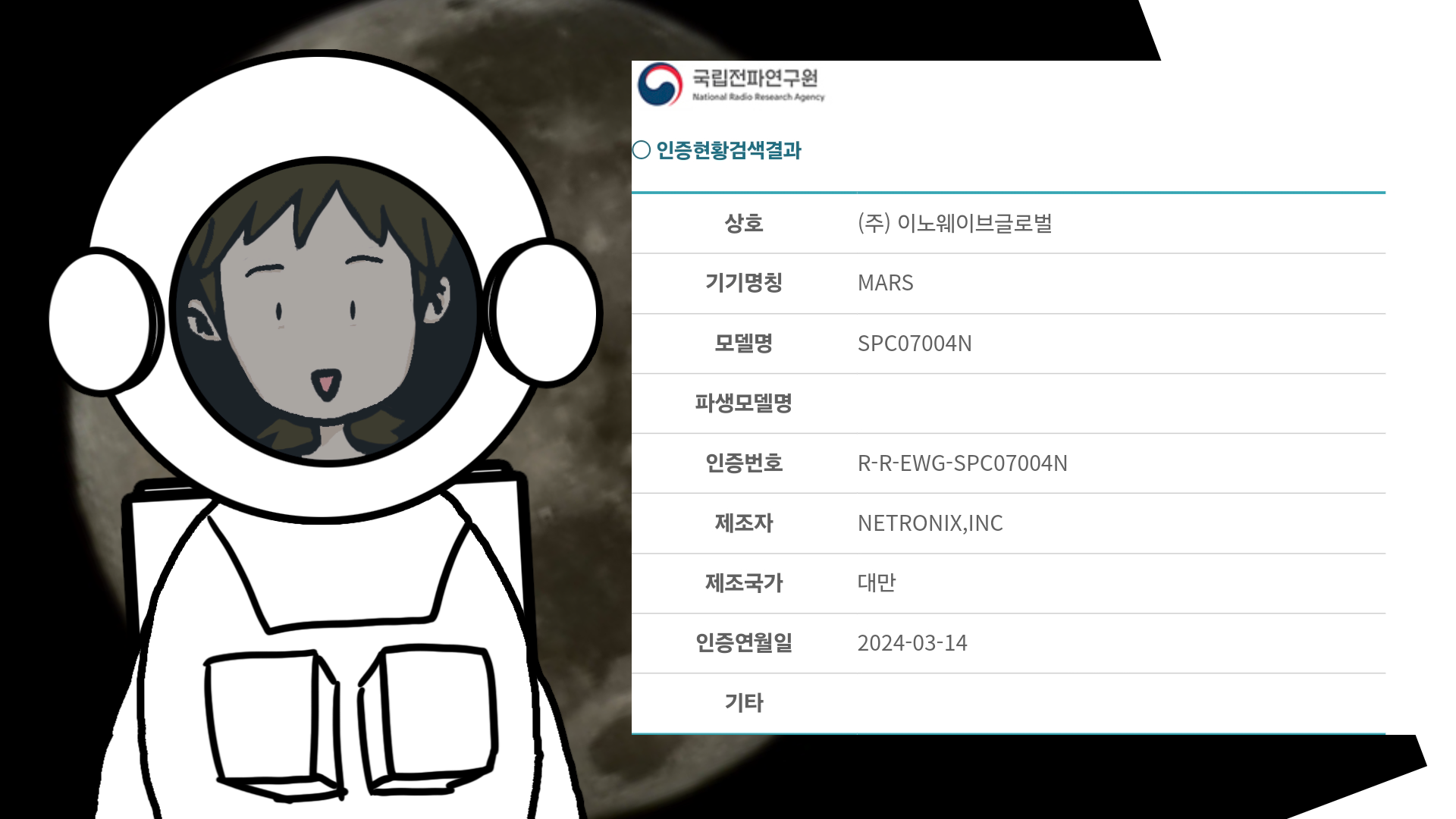 대만에서 제조했고, 2024년 3월 14일 전파 인증을 받고 국내에 정식 출시한 제품입니다.