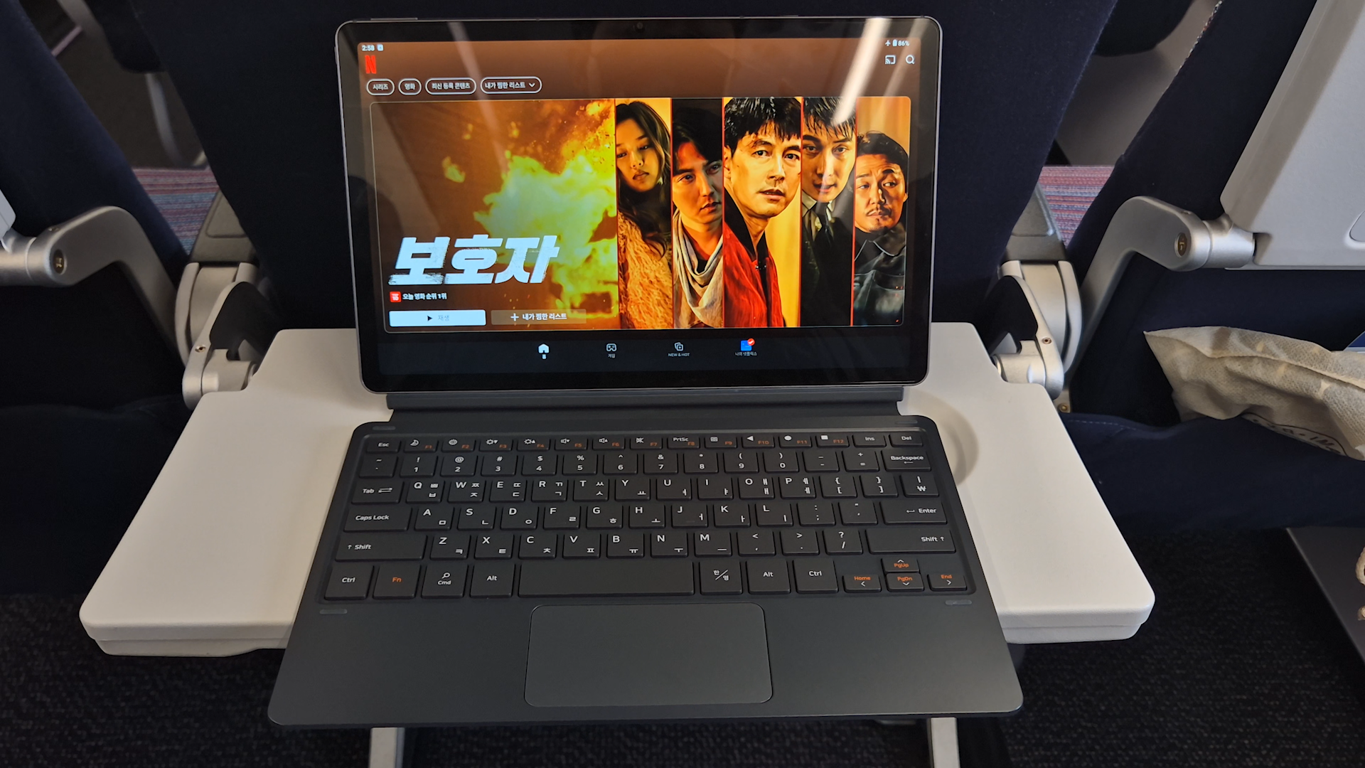 공간은 많이 차지하지 않아서 기내 식판에도 거치할 수 있었습니다.