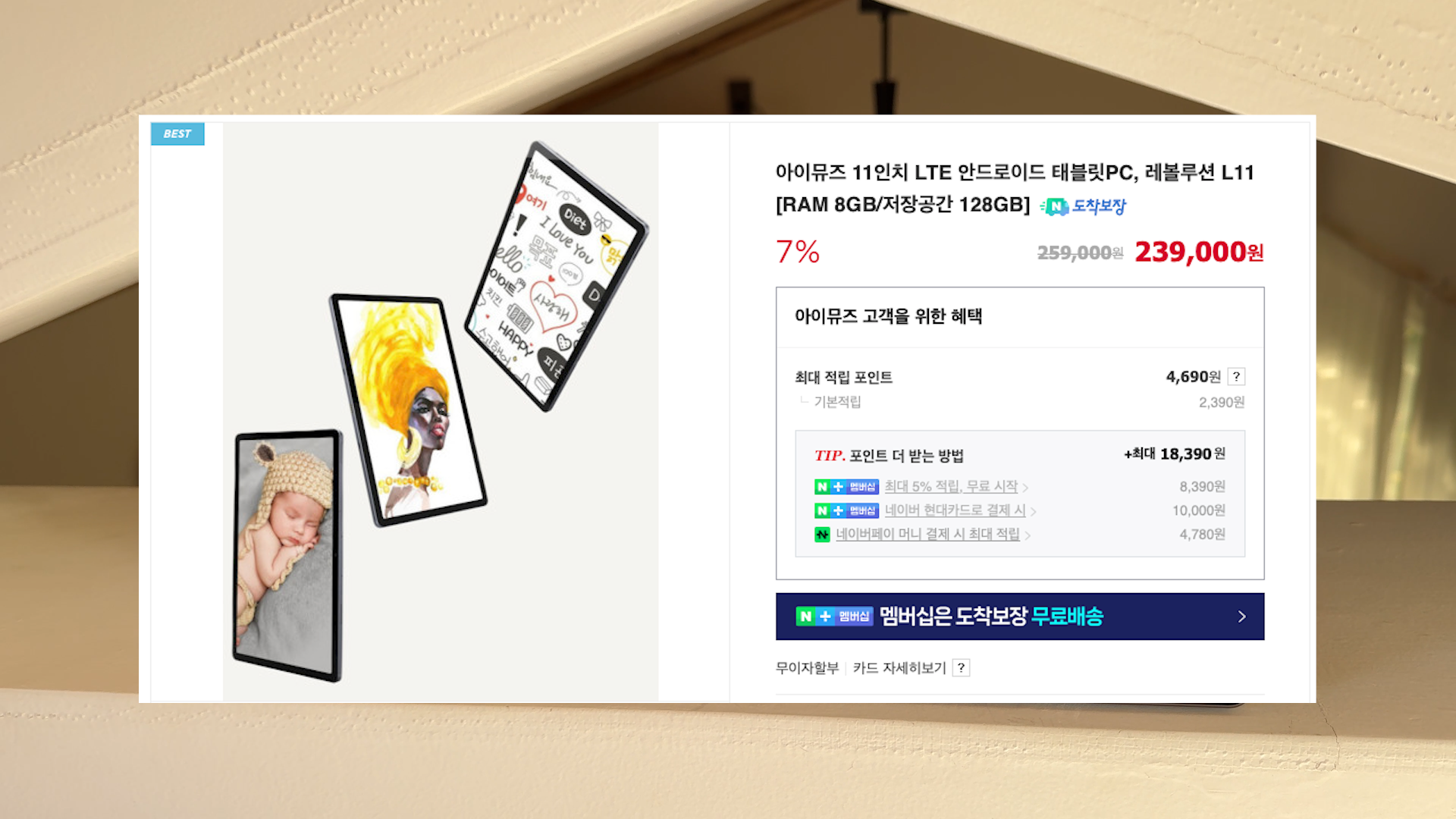아이뮤즈 L11은 출시가 259,000원입니다. 국내 중소기업 태블릿은 중국산 직구 제품보다는 금액이 조금 비쌀 수 밖에 없는데요 이 제품이 가성비 태블릿의 새로운 기준이라고 말할 수 있는 이유는 태블릿만 필요한 분은 단품으로 구입하면 되고 키보드가 필요한 분이나 펜이 필요한 분은 나중에 추가로 구입해도 되니까 초기 구입 부담을 덜어줘서 가성비를 중시하는 사용자에게 매력적인 옵션입니다. 그리고 대부분 저가 태블릿이 전용 키보드가 없는 제품들도 많고 펜을 쓰고 싶어도 사용을 못하는 제품들도 많은데 이 제품은 모두 지원해서 다른 저가 태블릿보다 성능면에서도 우위에 있습니다. 가격은 상시 할인가로 23만원 정도에 구입이 가능하고 두 차례 정도 19만원에도 판매한 적도 있어서 할인가에 맞춰서 구입한다면 중국산 직구 제품보다는 이 제품을 추천드립니다.