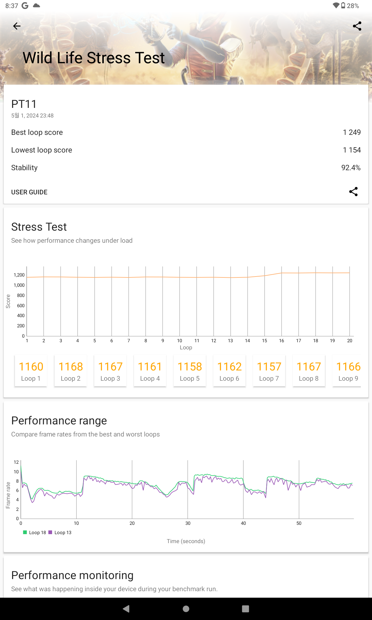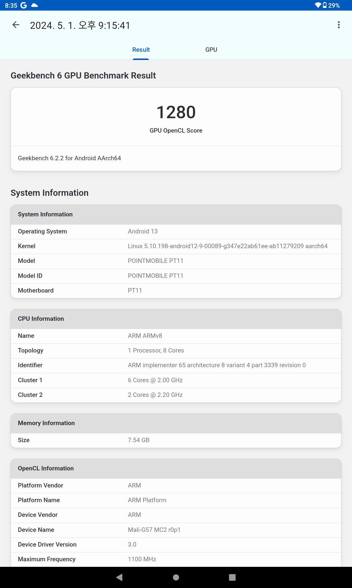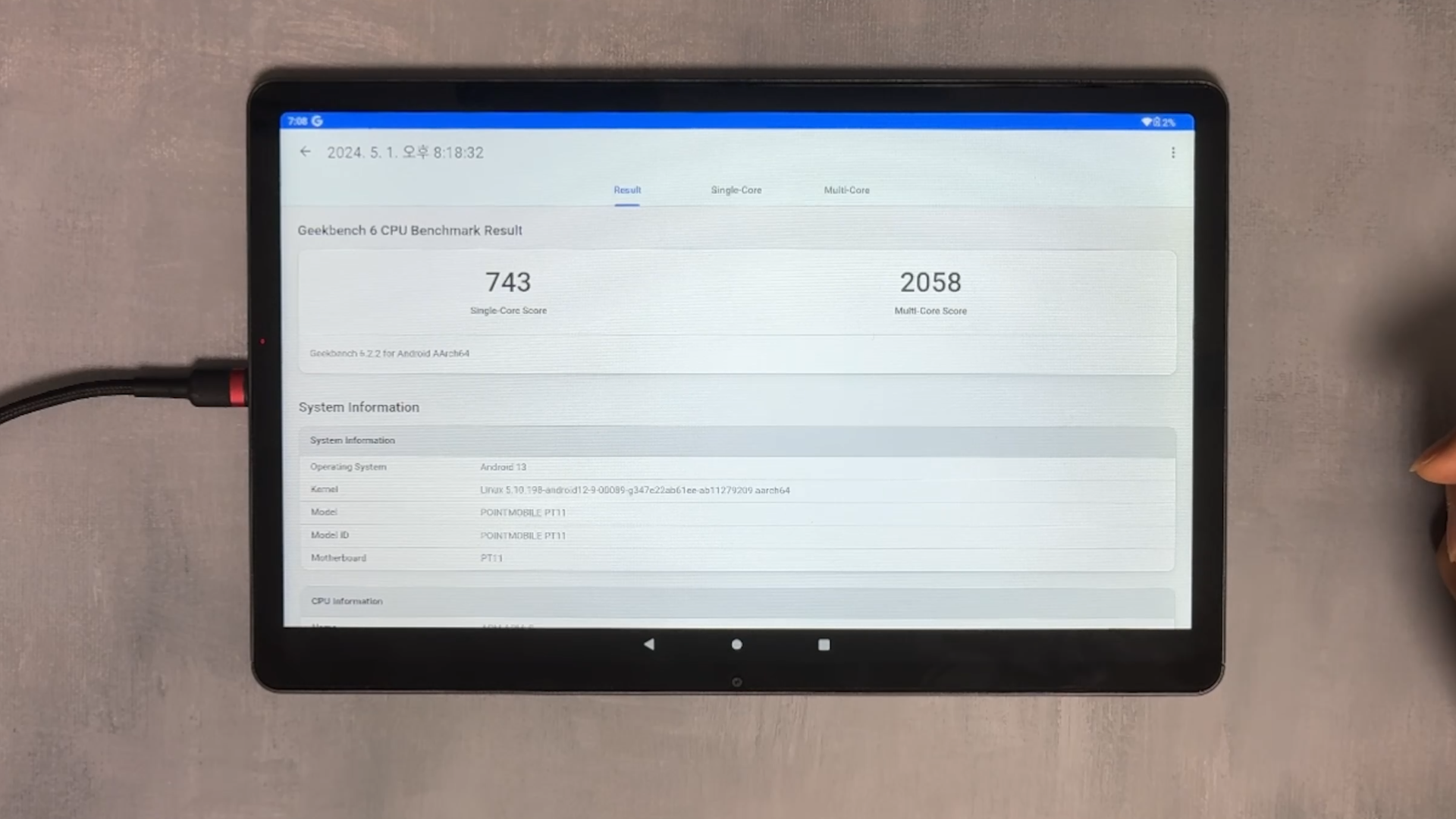 성능 면에서는 미디어텍 Helio G99 칩셋을 탑재하여 안정적인 성능을 제공합니다. 8GB RAM과 128GB의 저장 공간을 갖추고 있어, 멀티태스킹이나 일반적인 앱 사용에 있어서도 뛰어난 성능을 보여줍니다. 긱벤치 6 측정결과 싱글 743점, 멀티 2,058점 측정됩니다.