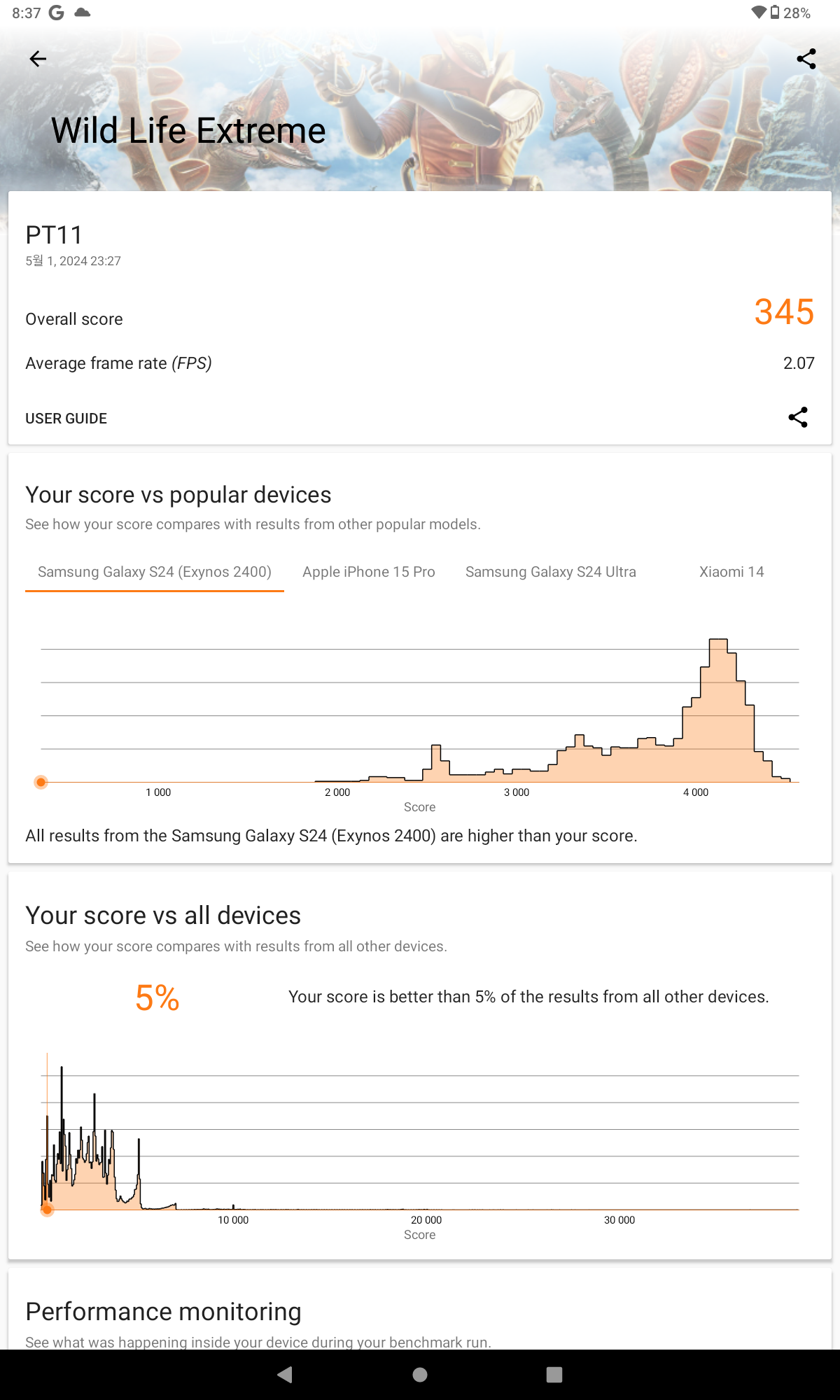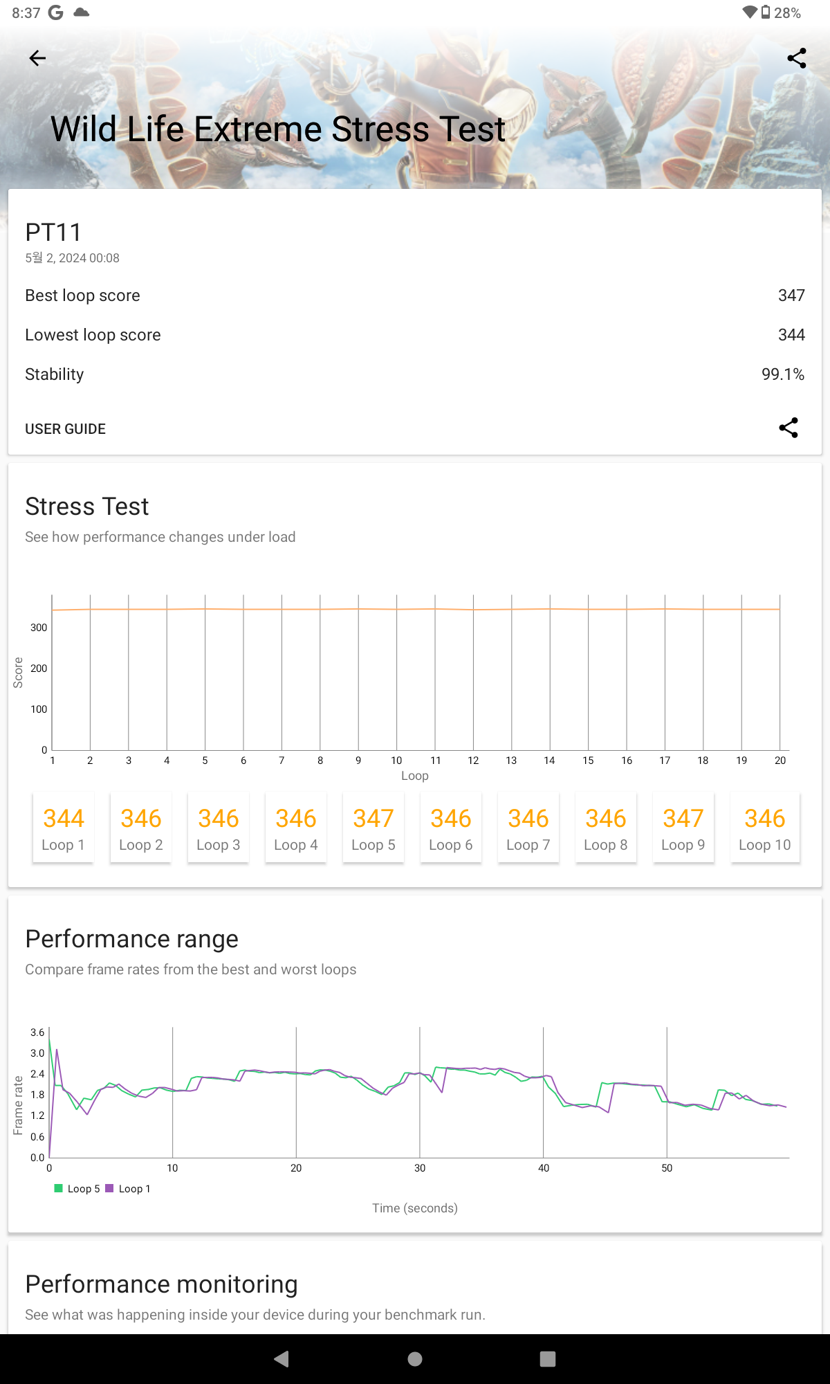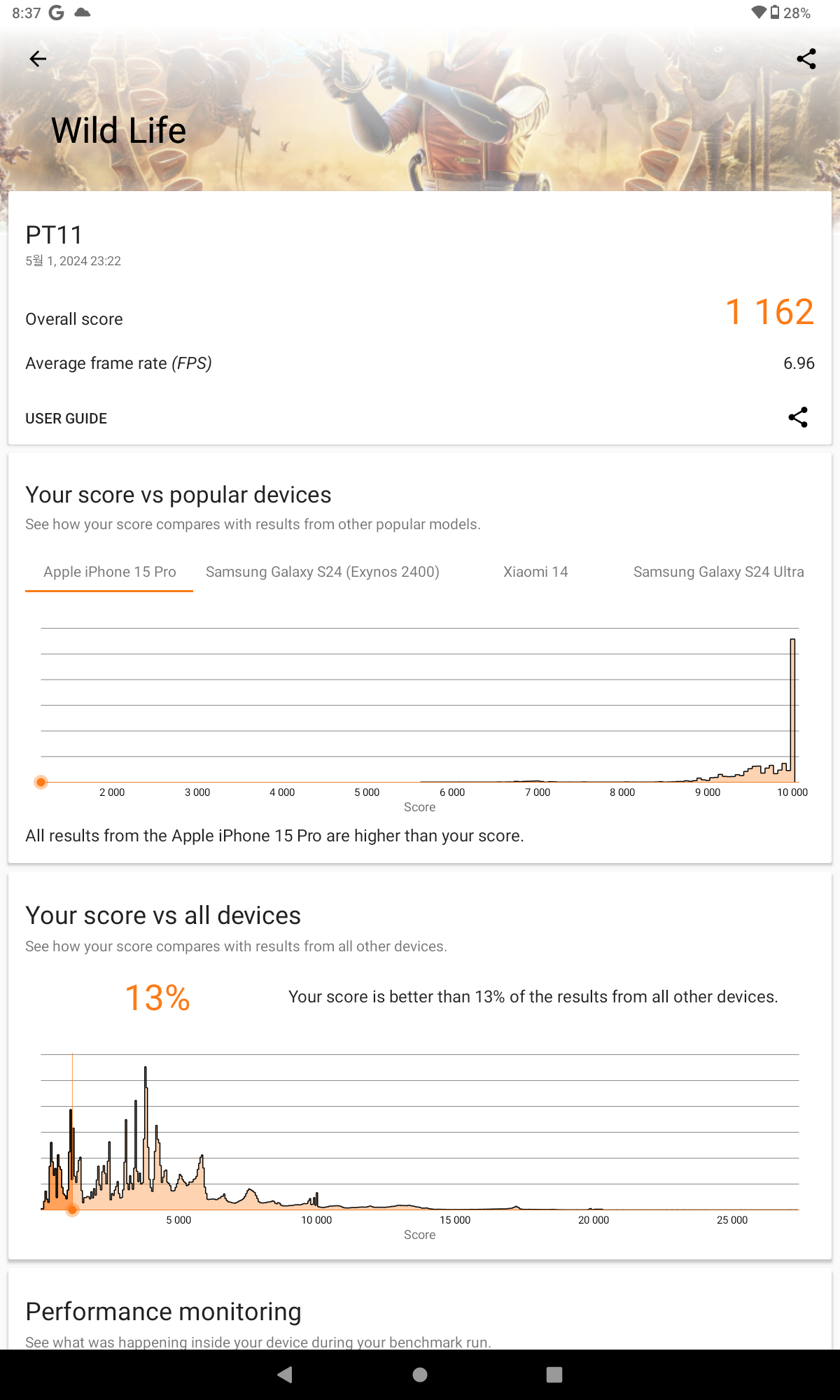 성능 면에서는 미디어텍 Helio G99 칩셋을 탑재하여 안정적인 성능을 제공합니다. 8GB RAM과 128GB의 저장 공간을 갖추고 있어, 멀티태스킹이나 일반적인 앱 사용에 있어서도 뛰어난 성능을 보여줍니다. 긱벤치 6 측정결과 싱글 743점, 멀티 2,058점 측정됩니다.