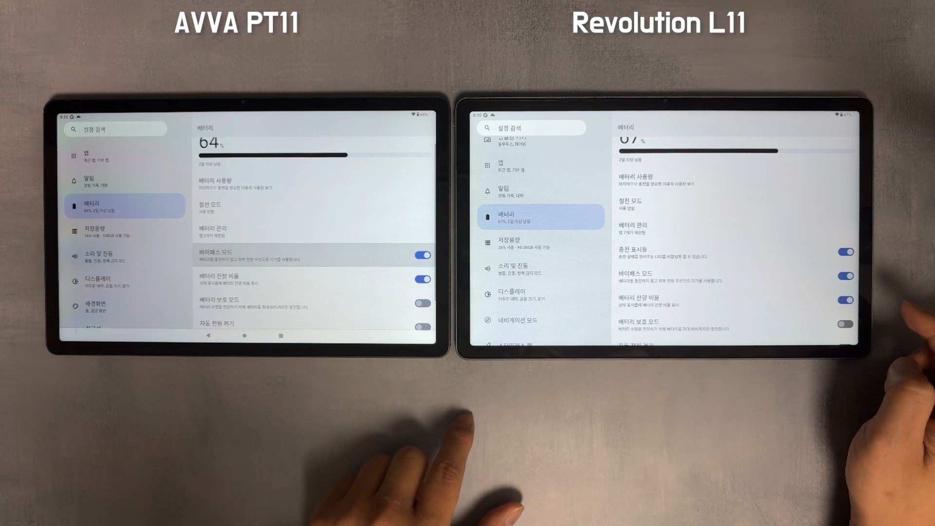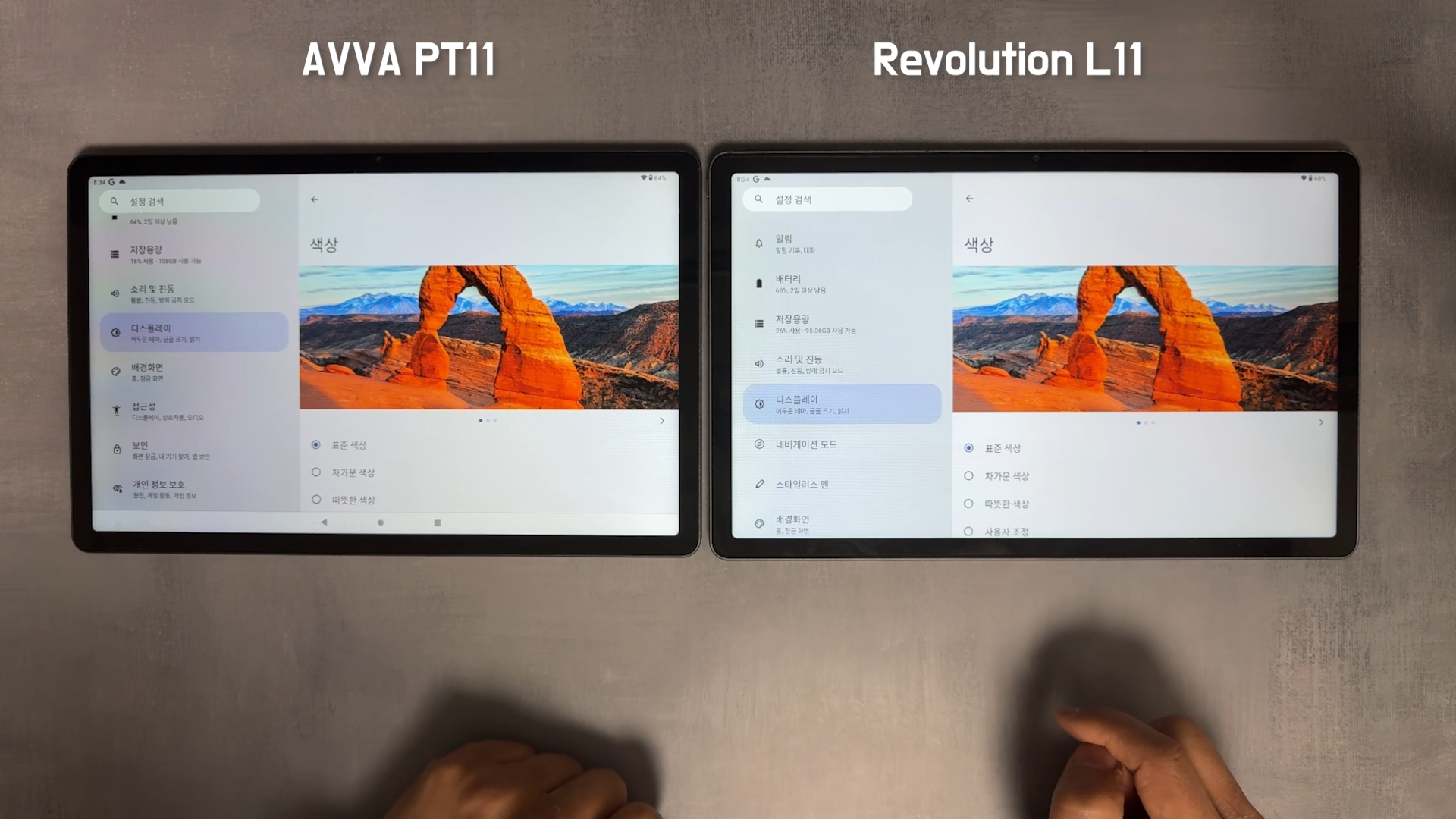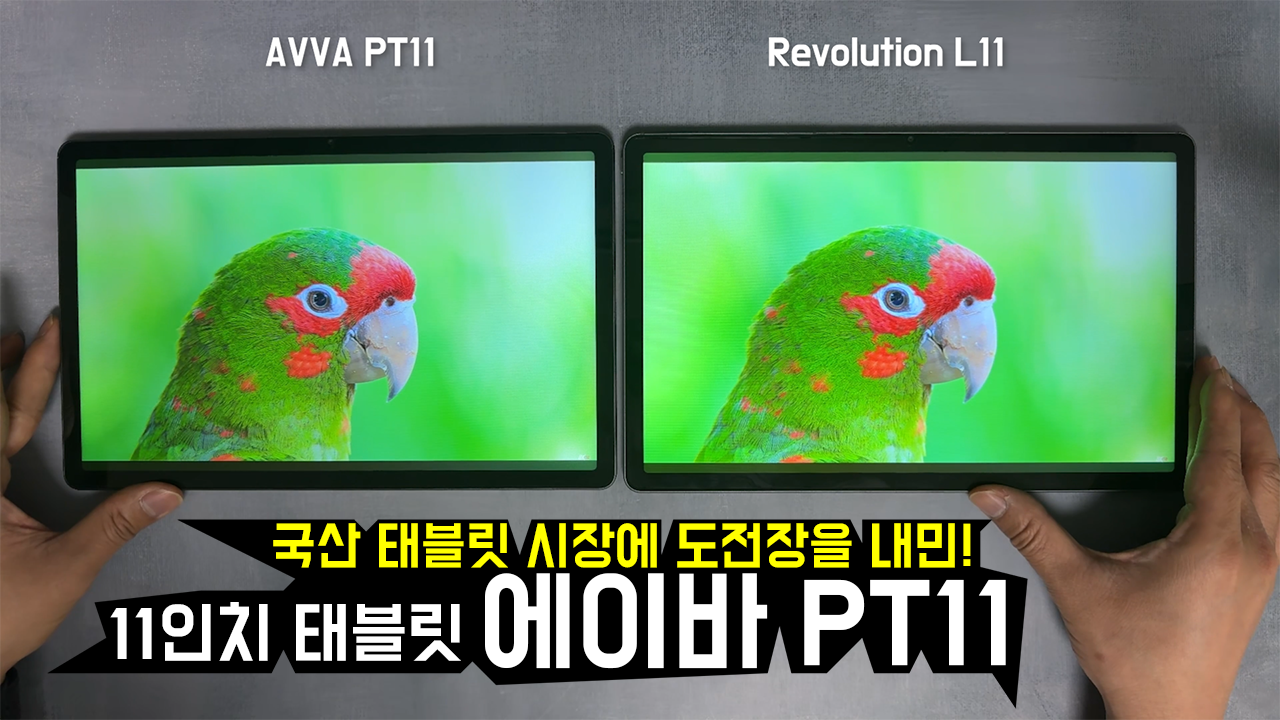 PT11은 OTT 플랫폼에서 고화질의 콘텐츠를 즐길 수 있도록 Widevine L1을 인증받았습니다. 아이뮤즈 레볼루션 L11 제품과 비교해보겠습니다. 두 제품 모두 11인치 IPS LCD 화면은 2K(2000x1200) 해상도를 제공하지만, 화면에서 보이는 화사함은 아이뮤즈 레볼루션 L11 제품이 더 좋았습니다. 두 제품 모두 밝기는 최대로 올린 상태입니다.