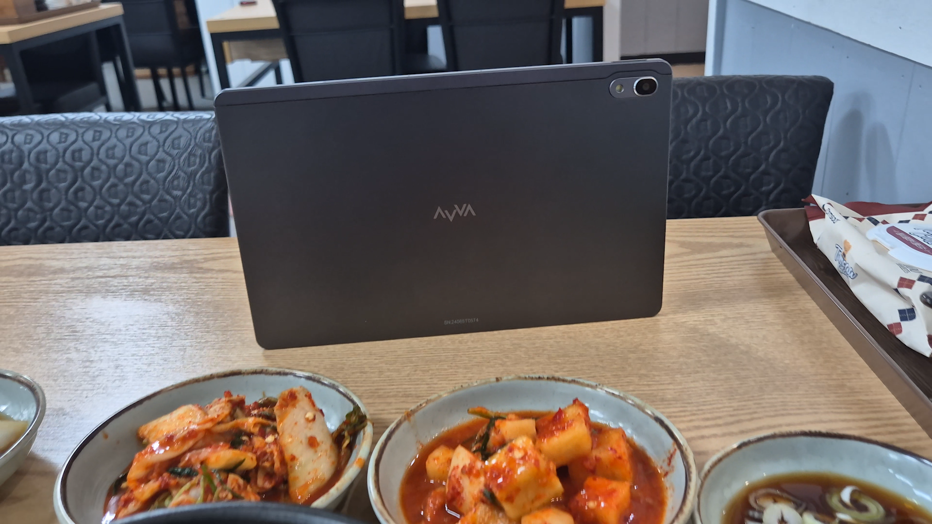 PT11 태블릿은 각진 디자인 덕분에 태블릿을 세워서 거치할 수 있습니다. 거치대만큼 안정감 있지는 않겠지만 거치 케이스를 안 가져왔을 때 잠깐씩 사용하기에는 좋습니다.