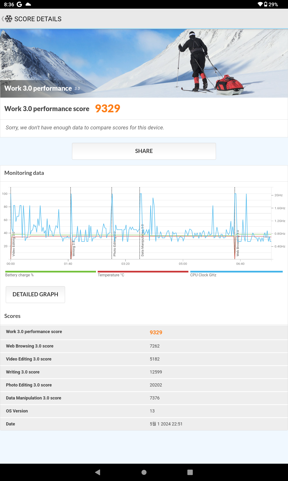 PCMark에서 태블릿의 전체적인 성능은 9,329점 측정되었습니다.