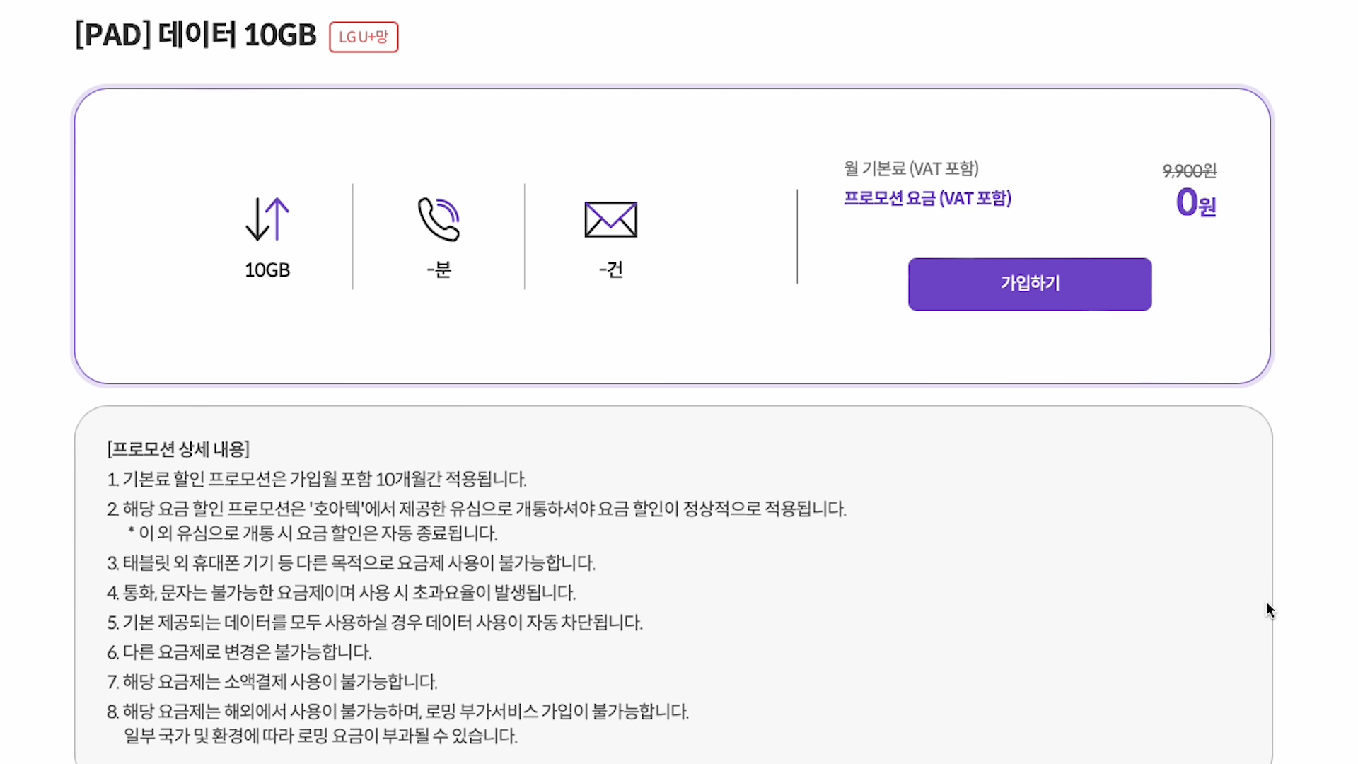 KG 모바일 알뜰폰 유심입니다. 한 달에 10GB 제공하고, 10개월 동안 총 100GB 용량을 무료로 제공을 합니다.