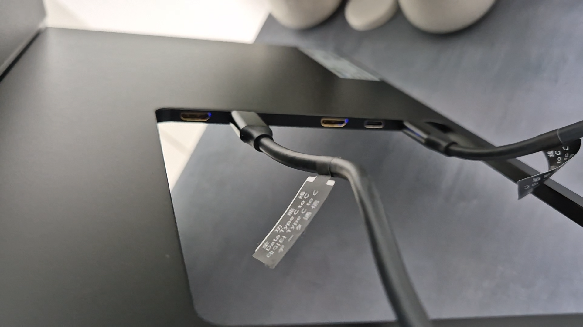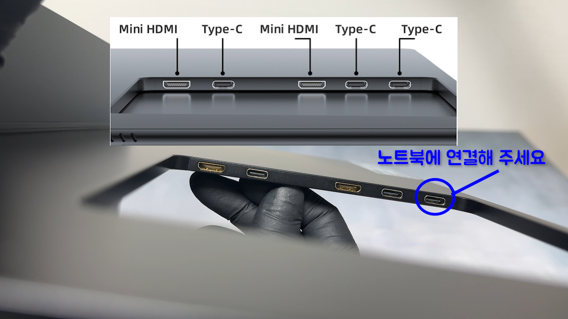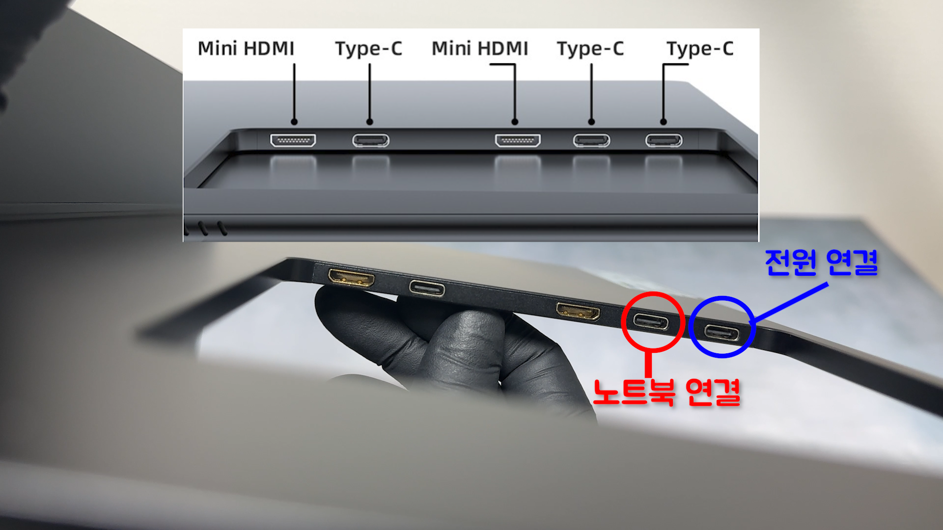 HDMI 지원만 되는 노트북을 사용한다면 하단에 Type C to C 케이블을 연결해서 전원 공급을 해줘야 됩니다.