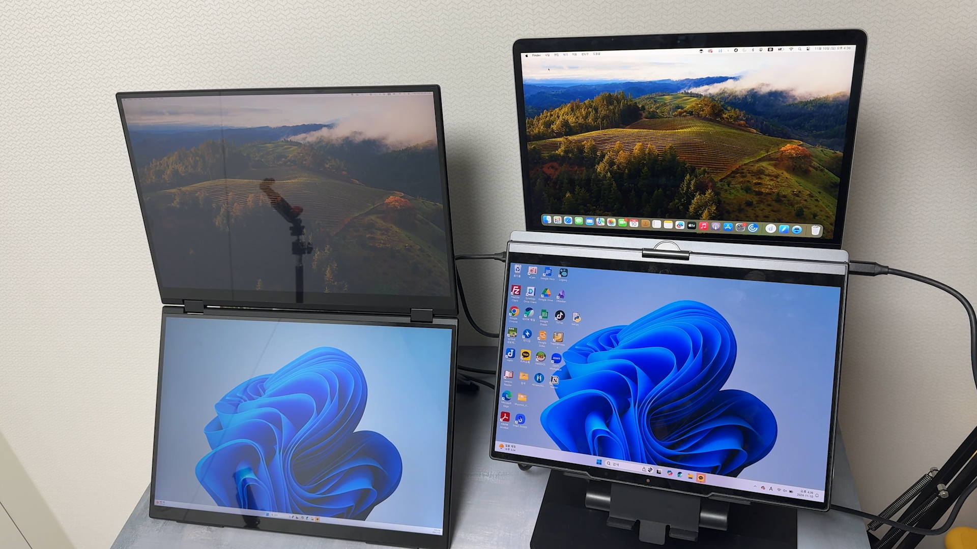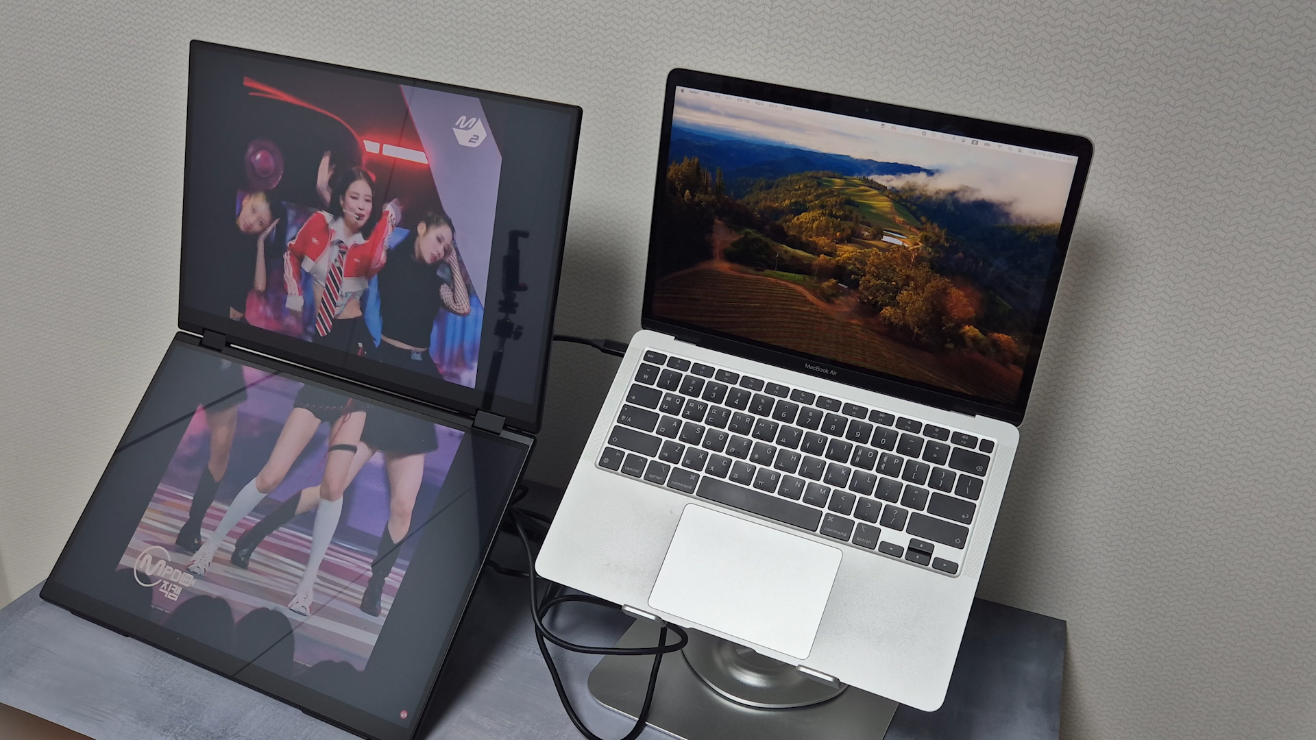 제품을 펼치면 이런 느낌으로 듀얼 모니터를 사용할 수 있습니다. 멀리서 보면 마치 노트북을 거치대에 올려둔 느낌입니다. 전체적으로 디자인은 깔끔하고 마감도 우수합니다.