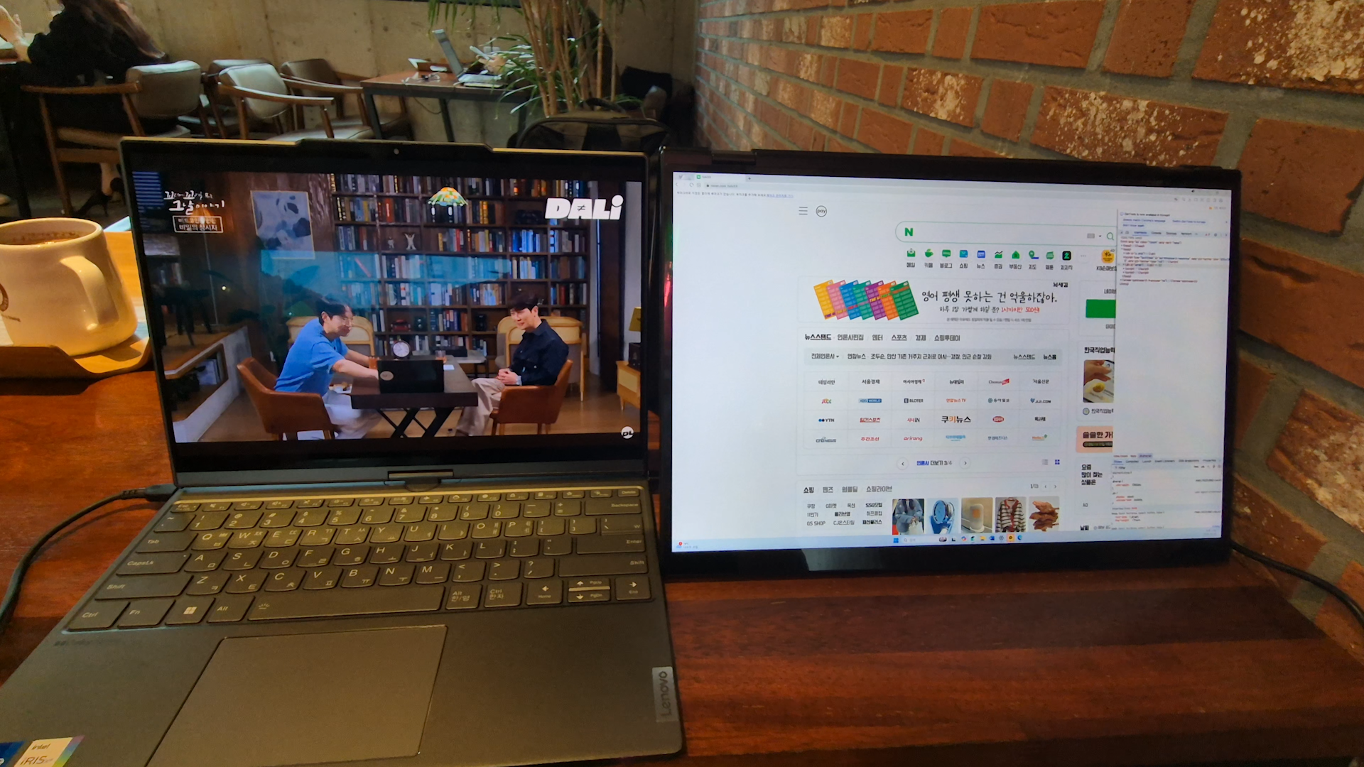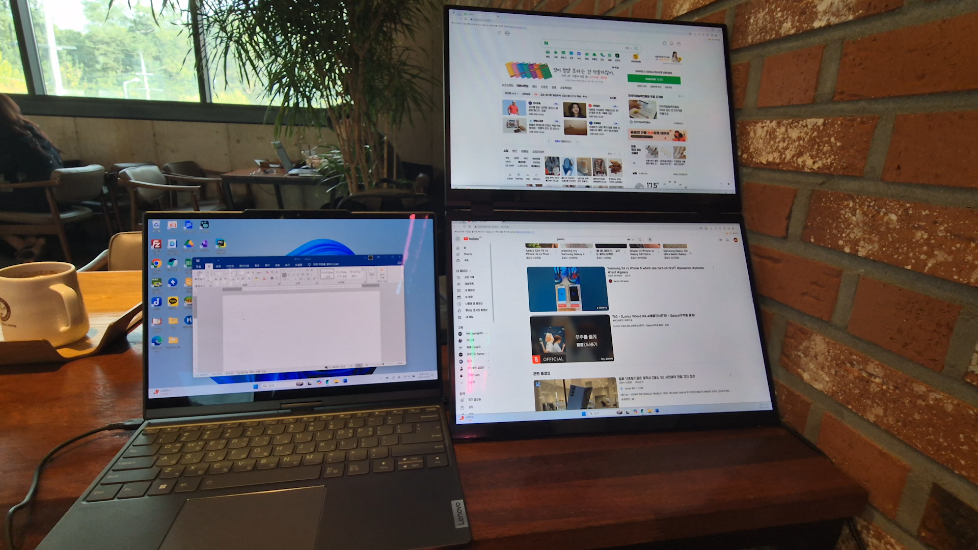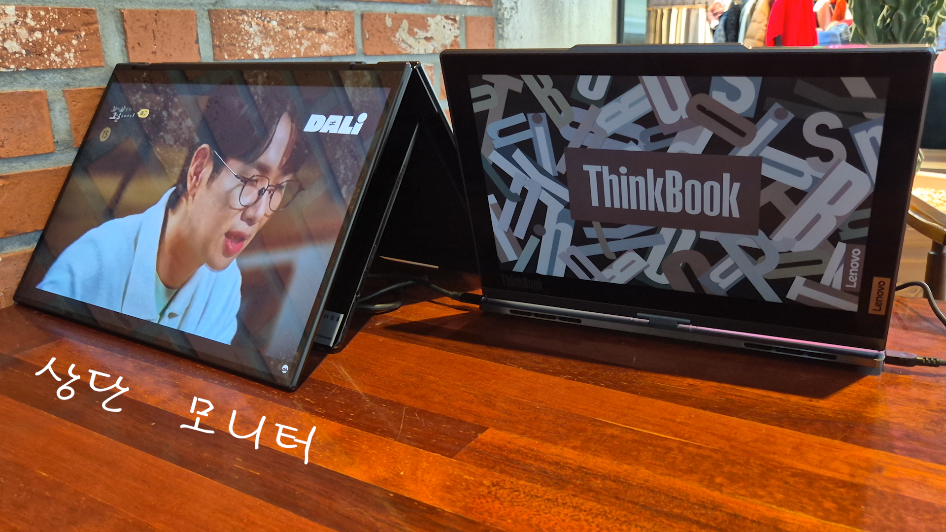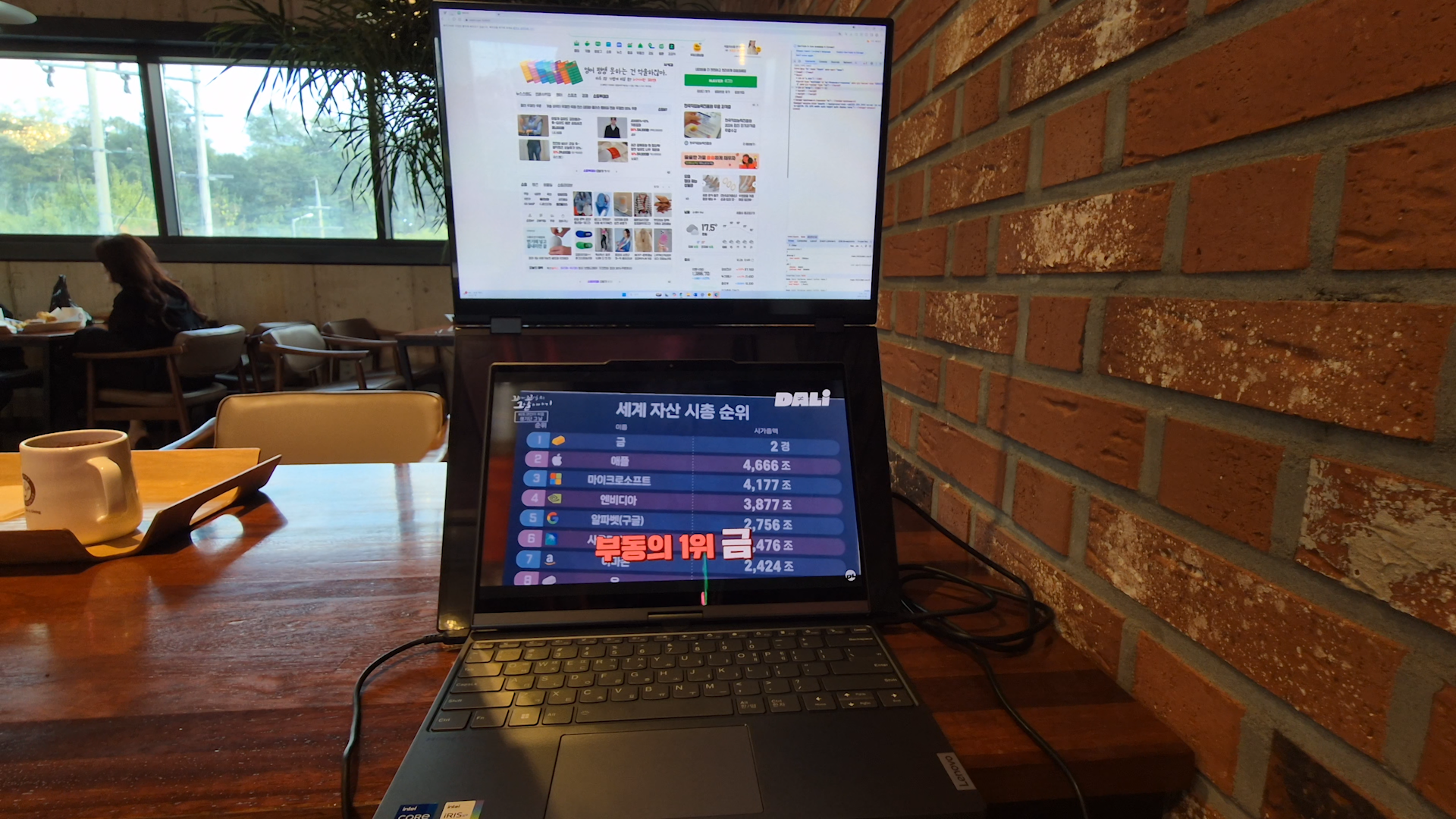 대화면 모니터에 노트북까지 양쪽에 펼쳐서 사용하면 자리를 많이 차지하게 됩니다. 작업 환경에서는 상관없는데, 카페와 같이 협소한 테이블의 경우에는 커피 둘 공간도 부족하다는 느낌은 들었습니다. 이럴때는 위쪽 모니터에만 연결해서 공간을 줄이는 방법도 있습니다. 듀얼 디스플레이 노트북 느낌으로 사용이 가능합니다.