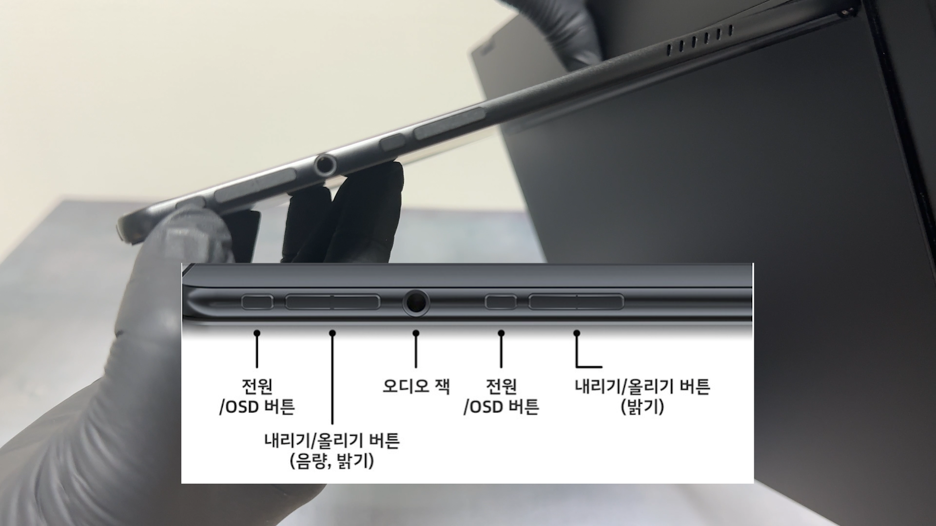 거치대에 전원/OSD 버튼, 음량과 밝기 조절 버튼이 있고 오디오 잭이 있습니다. 디스플레이가 개별 동작이 가능해서, 위/아래 세트로 2개씩 버튼이 있습니다.