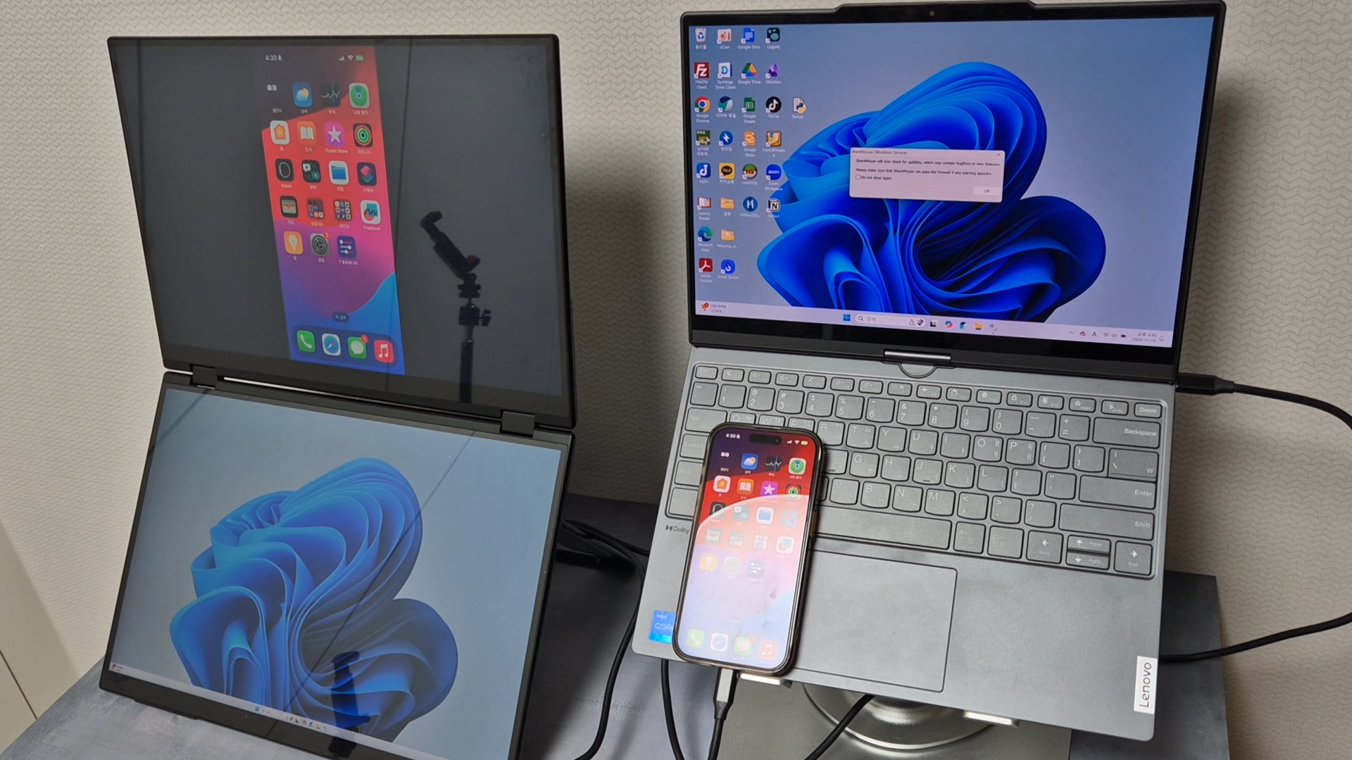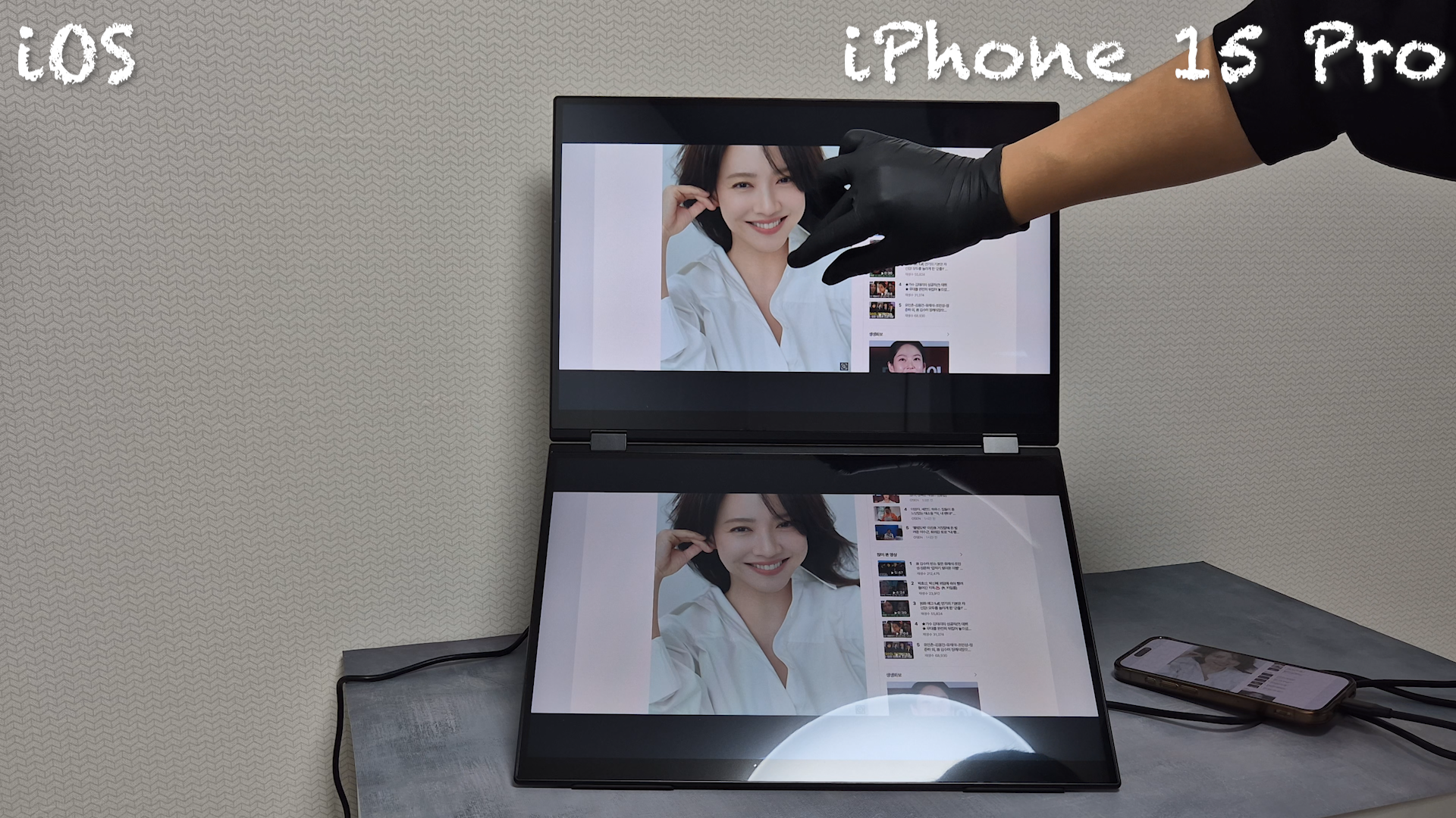 아이폰도 위쪽 포트에 연결하면 위쪽 모니터는 아이폰 단독으로 사용 가능하고 아래쪽 모니터는 노트북 보조 모니터로 사용이 가능했습니다.