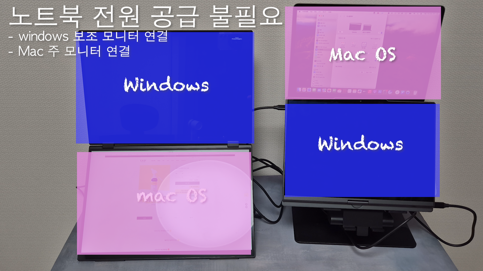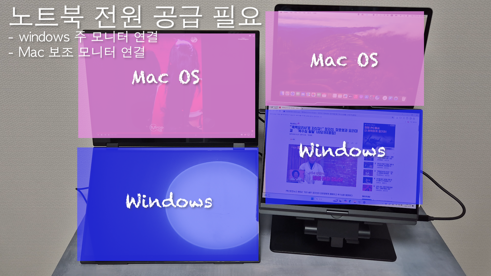 전원 공급을 받고, Windows 노트북을 상단 모니터에 연결하면 MacBook에 외부 전원 공급을 안해도 정상적으로 두 제품 모두 사용이 가능했습니다. 하단에 전원 공급을 받는 제품의 소비 전력이 낮아야 된다는 거죠