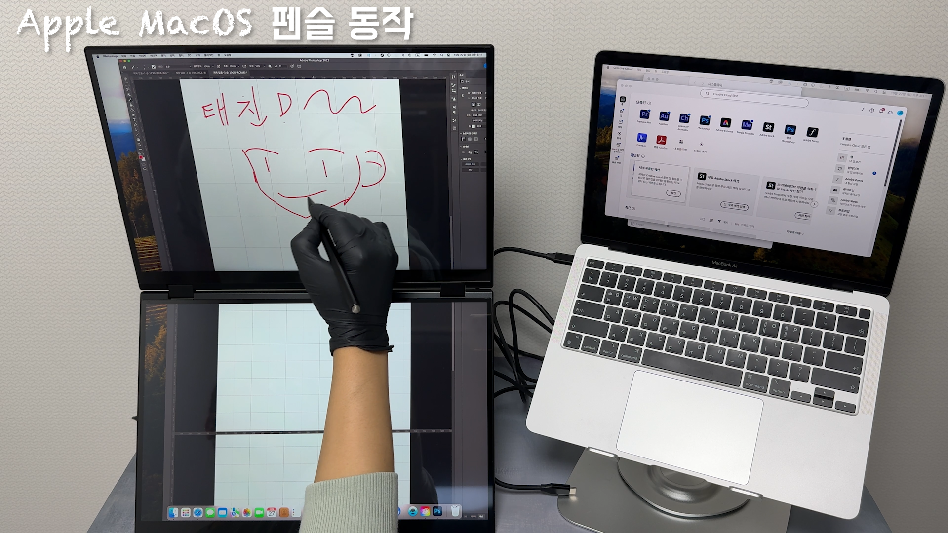 필기를 할 때도 macOS와 Windows OS에 차이점이 있습니다. MacBook에서는 필압 기능을 지원하지 않아서 정전식 터치펜으로 글씨를 쓰는 느낌입니다. 이 부분에 대해서 판매자에게 문의했는데요 mac OS 사용자들을 위해서 펜의 압력 감지 지원과 터치 기능 최적화 등을 포함한 소프트웨어를 개발중이라는 답변을 받았습니다. 나중에 사용자들이 다운로드하여 사용할 수 있도록 제공한다고 합니다.