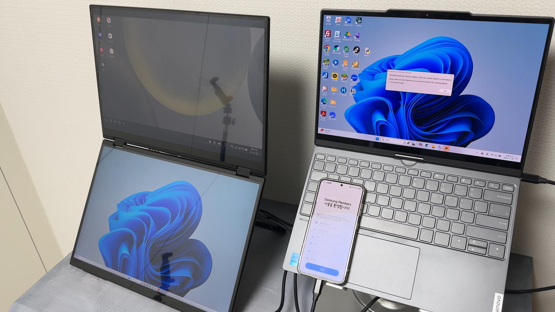 Android 폰은 그런거 없습니다. 갤럭시 S24 스마트폰을 연결해 줬더니, DeX 모드까지 전환돼서 컴퓨터를 사용하는 느낌으로 편하게 사용 가능했습니다. 터치를 위해서 별도 설정을 한다거나 하는 제약사항도 없었습니다.