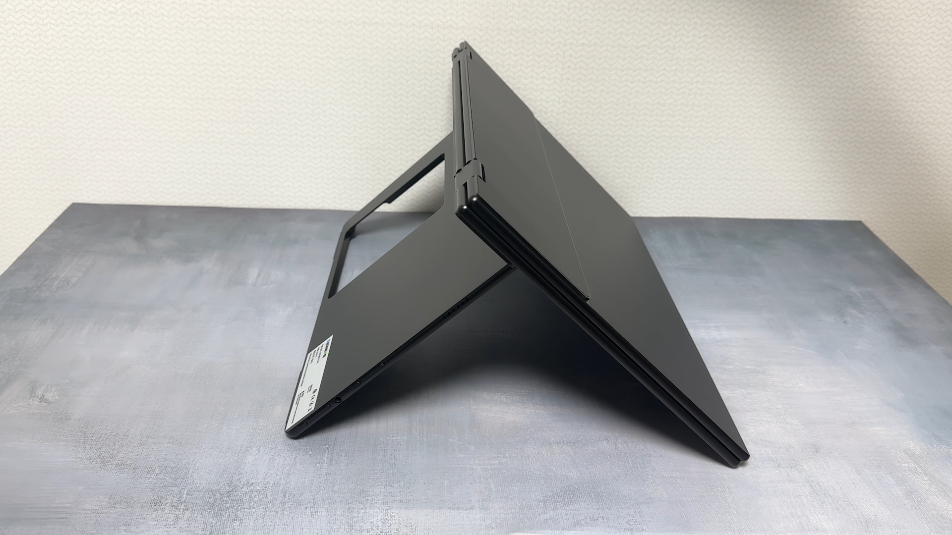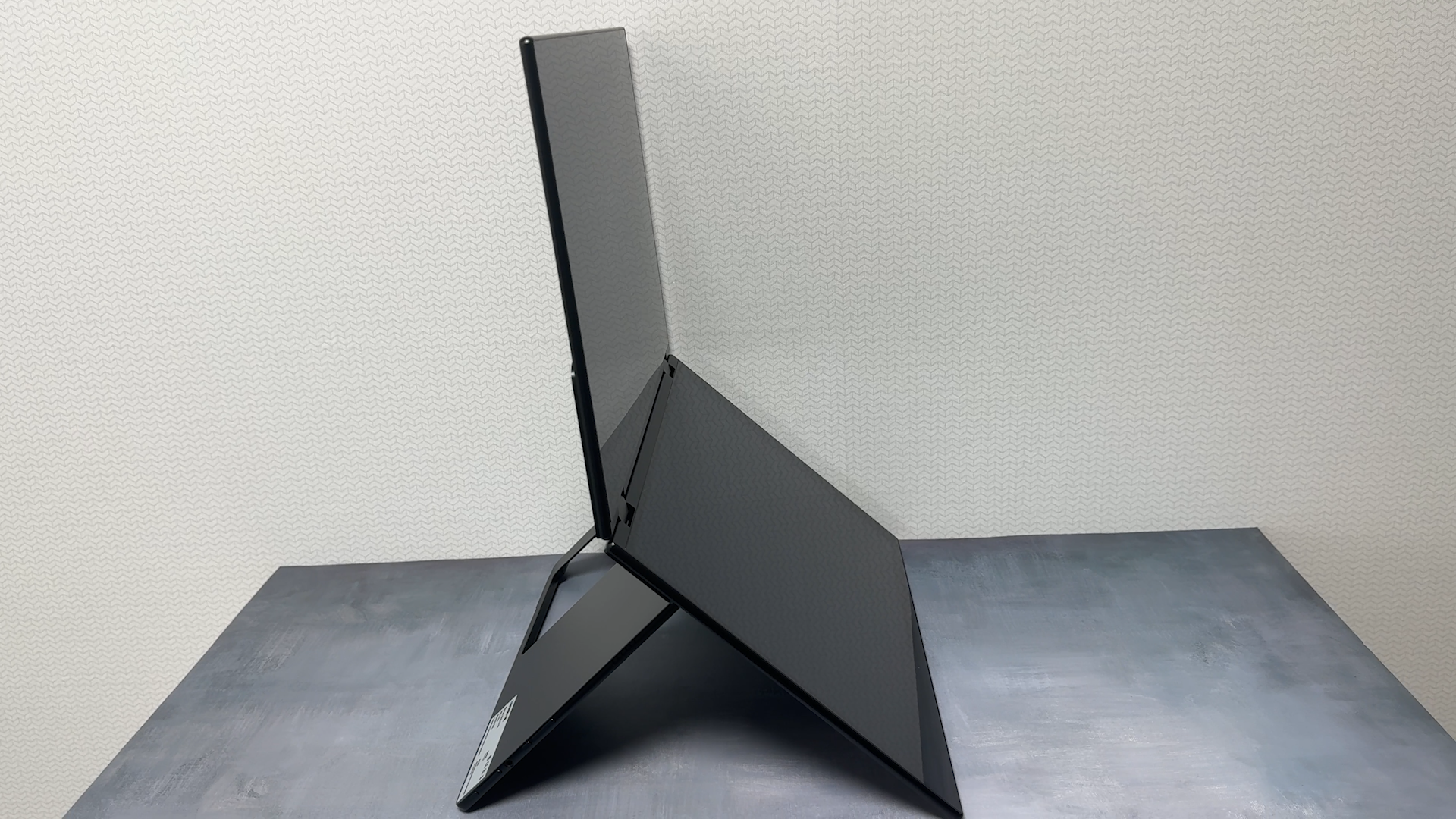 측면은 두개의 디스플레이가 겹쳐져 있어서 거치대 제외하고 17mm 두께의 제품입니다. 거치대는 6.2mm 두께입니다. 폴딩 디자인으로 최대 각도는 90도까지 앵글 조절이 가능합니다.