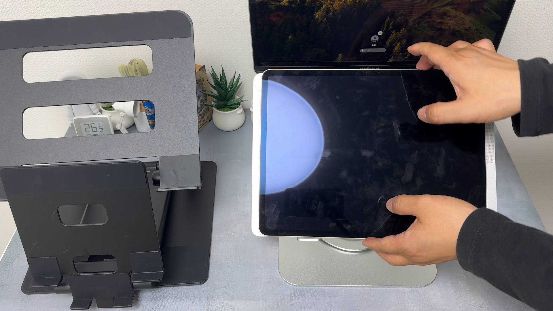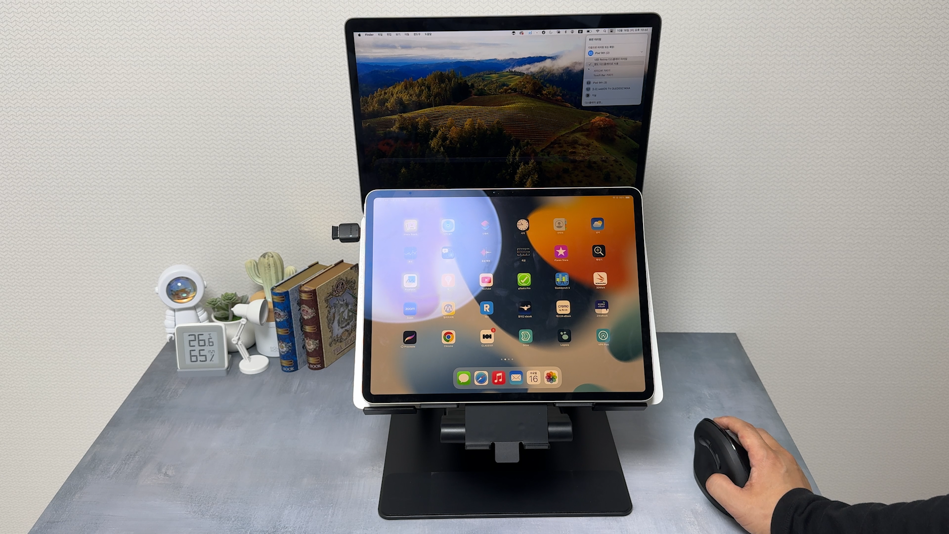 거치해서 사용하면 이런 느낌인데요. 맥북과 아이패드 조합으로 사용하면 그런데로 모니터 역할을 잘 했었습니다. 하단에 아이패드 12.9인치를 올려놓아서 그런지, 이렇게 보면 마치 듀얼 모니터를 사용하는 느낌이 들지 않으세요?