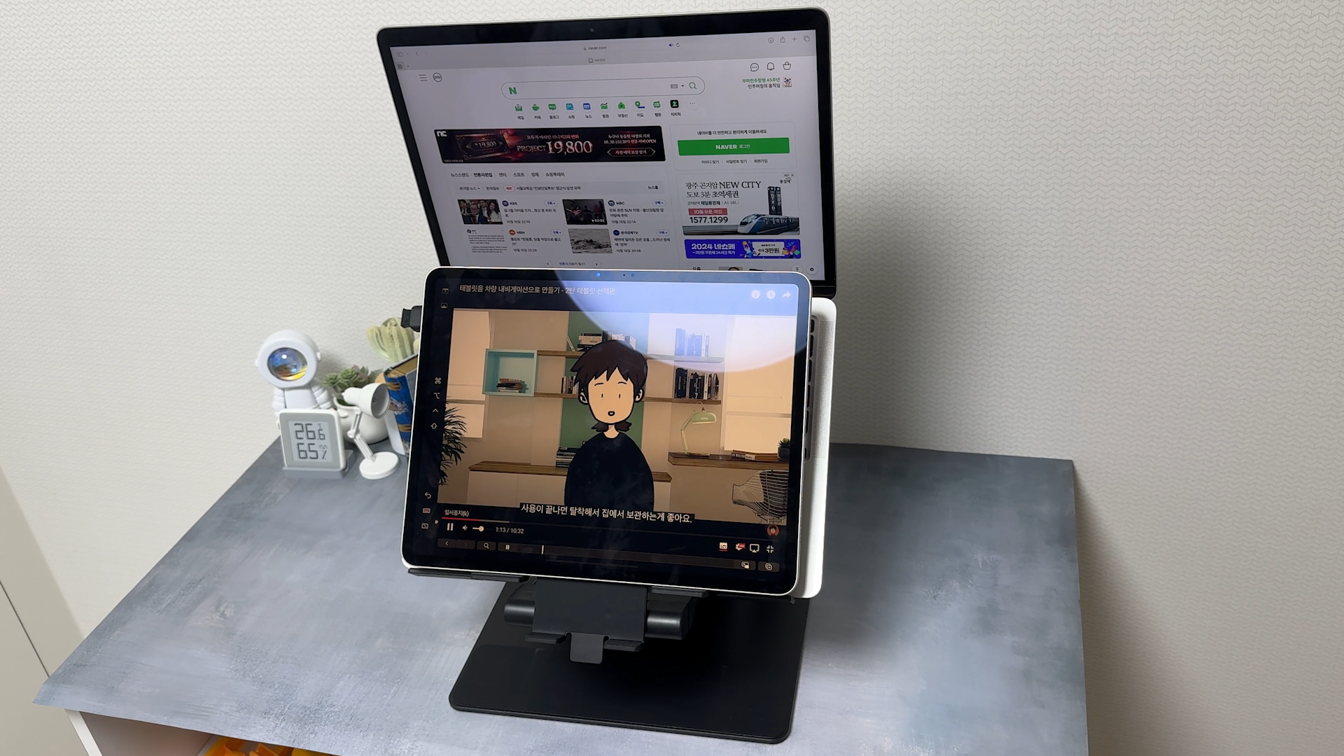 하단에 태블릿만 거치가 가능한게 아니죠 EHOMEWEI X2 Pro 듀얼 모니터 리뷰때 보여드렸는데 이렇게 화면이 회전되는 2 in 1 노트북을 사용하는 분들은 2개의 노트북을 거치할 수도 있습니다. 그럼 책상의 공간도 확보할 수 있고, EHOMEWEI X2 Pro 듀얼 모니터 같은 제품을 활용한다면 마치 쿼드 모니터를 사용하는 효과도 있습니다.