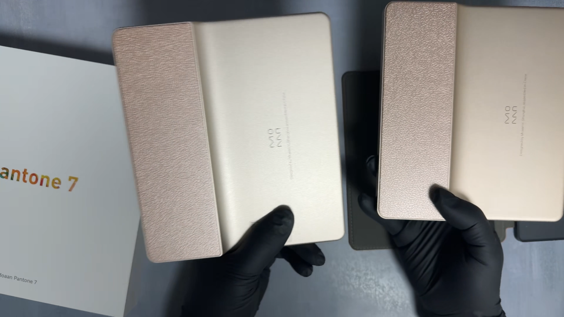 아래쪽은 USB-C 타입 포트가 있고요 왼쪽은 상당히 얇은 두께로 되어 있습니다. 이런 비대칭 디자인은 그립에 무게 밸런스를 둬서 손목에 피로를 주지 않도록 설계되어 있습니다. 간혹 이런 디자인을 보면 아마존 킨들 오아시스 디자인 카피라고 말하는 분들도 있는데요 좋게 보면 검증된 디자인에 구글 Play 스토어까지 되는 제품이라고 보면 되겠네요 무게를 비교해 보면 Moaan MIX7S 210g인데, Pantone 7은 214g 으로 더 무겁습니다. 그립 부분 두께를 보면 MIX7S는 8.8mm 나오는데 Pantone 7은 9mm 측정이 되어서 두께도 Pantone 7이 소폭 상승했습니다. 가장 얇은 부분은 두 제품 모두 3.2mm 동일하게 측정이 됩니다.