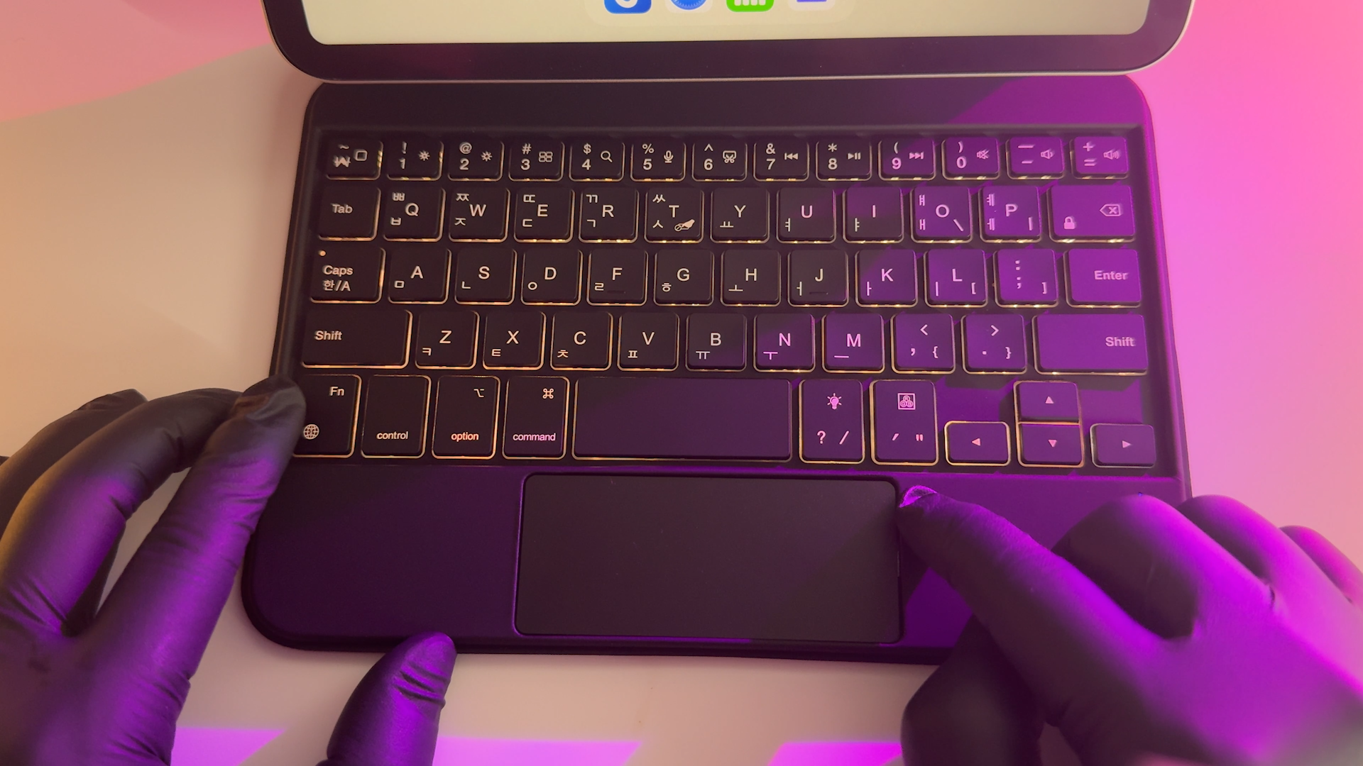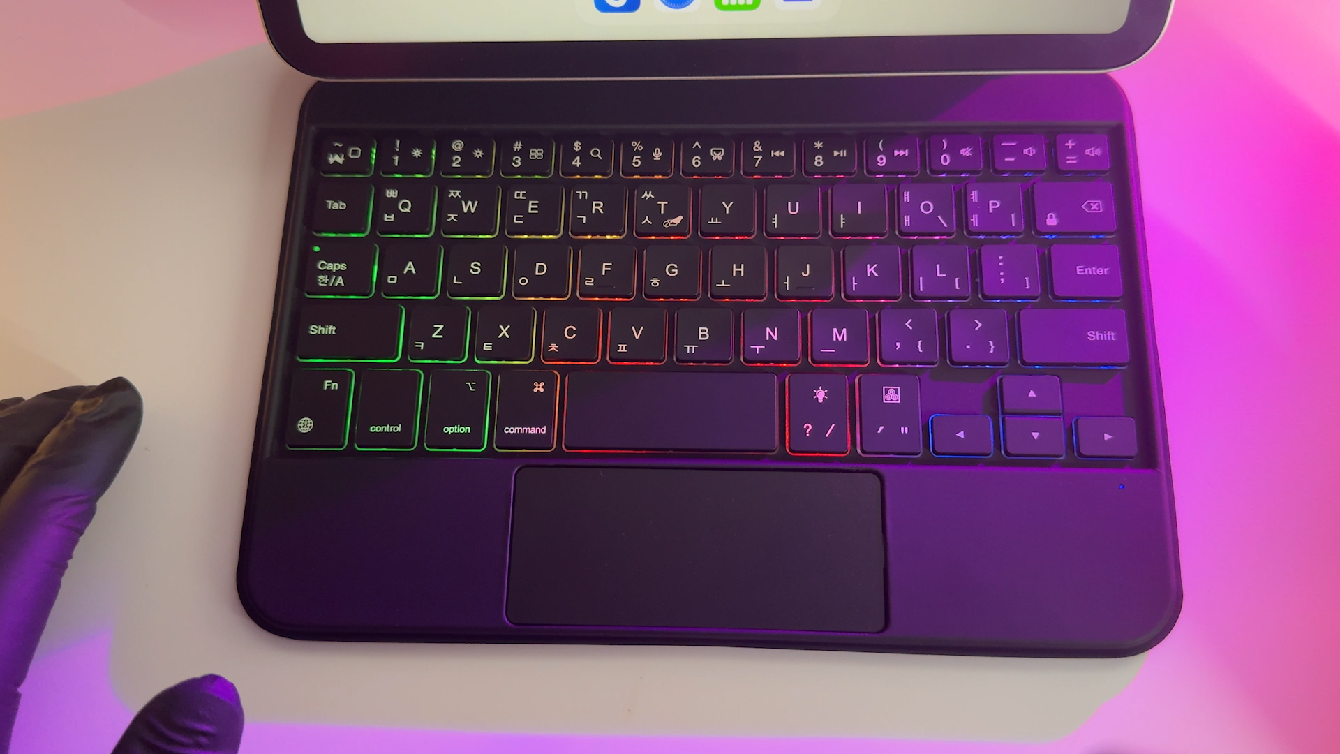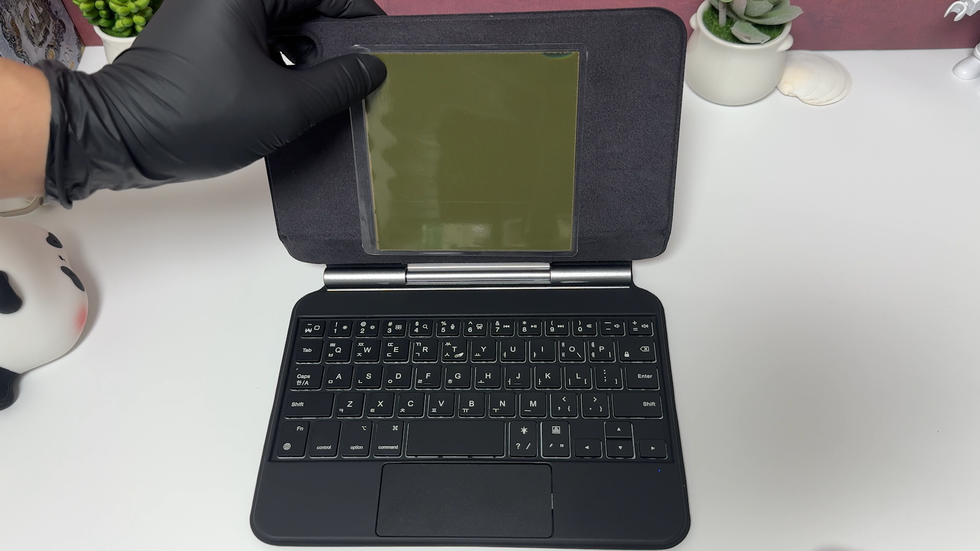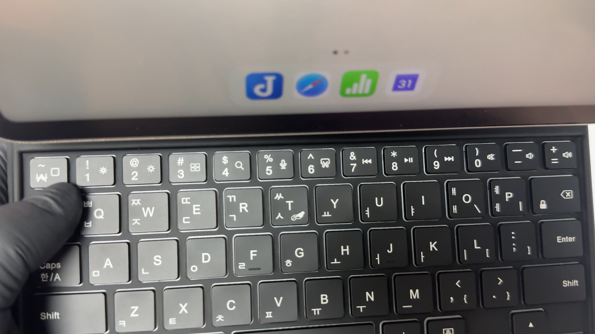 키보드는 블루투스 5.2 방식으로 페어링하면 사용할 수 있습니다. 포고핀 방식은 반드시 부착해서 사용해야 되지만 블루투스 방식은 탈착한 상태에서도 타이핑이 가능합니다. 펜타그래프 키보드를 사용하는데 키감은 맥북 보다는 가벼운 키감을 제공하는 것 같네요 일반적인 시중에서 판매하는 휴대용 블루투스 키보드와 동일합니다. 미니 사이즈라서 손이 큰 분은 사용하기 불편할 수도 있을 것 같습니다. 참고로 저는 평균적인 여성분들 손 크기 정도라서 여성분들이 사용하기에는 괜찮을 것 같습니다.