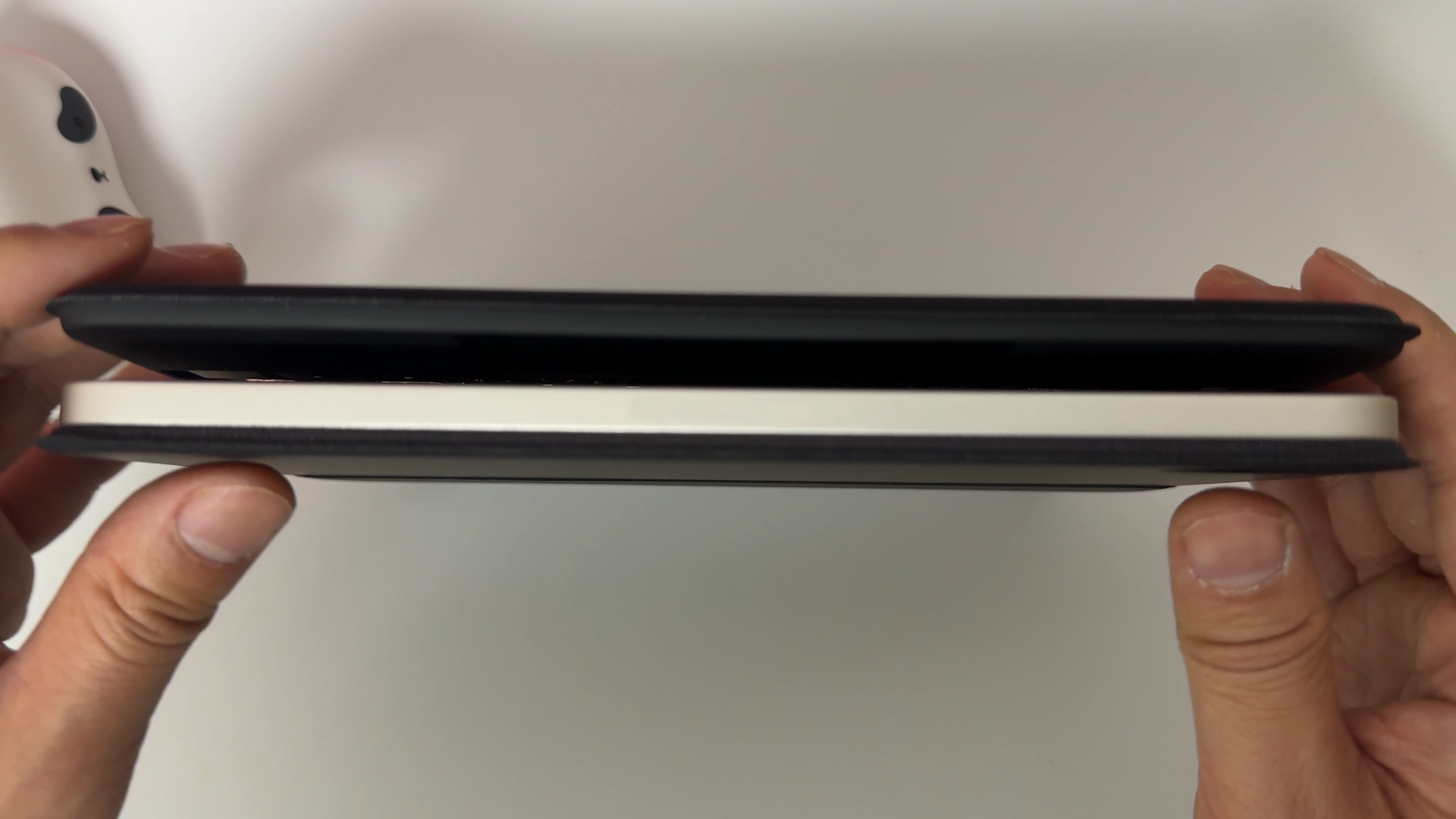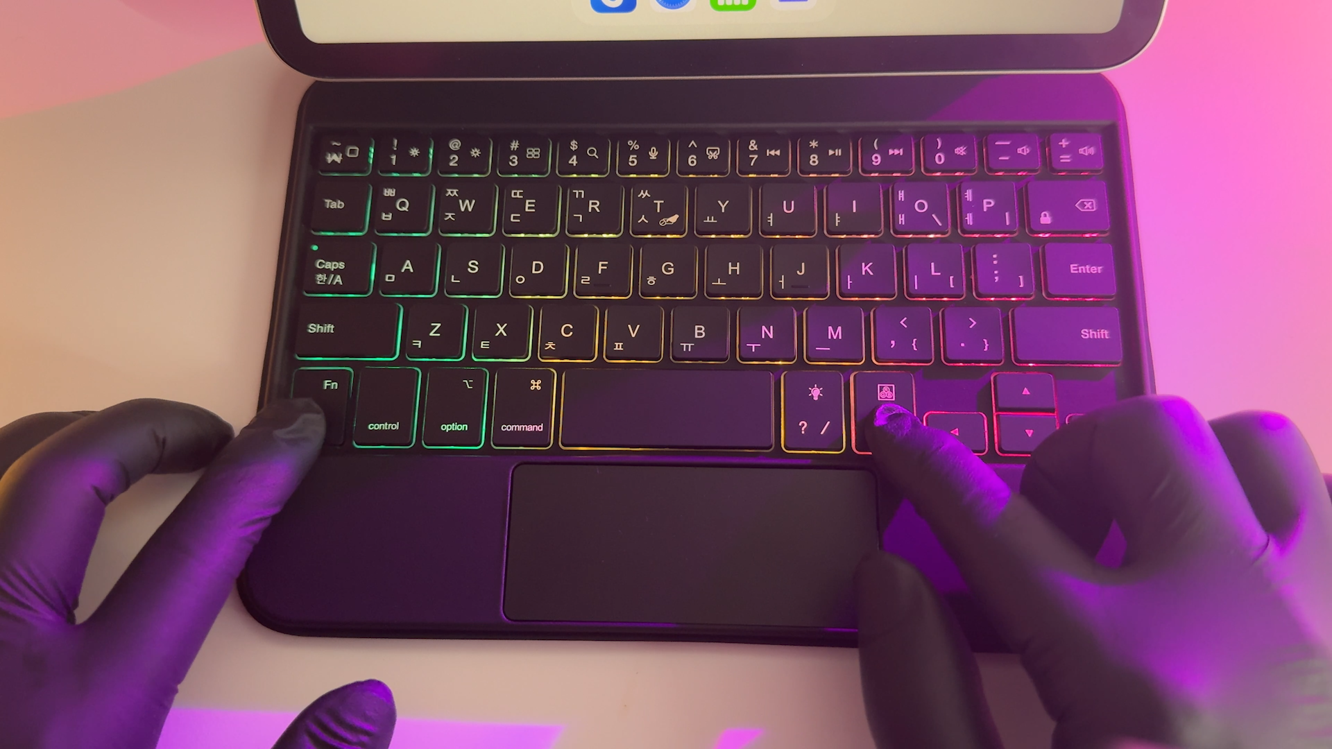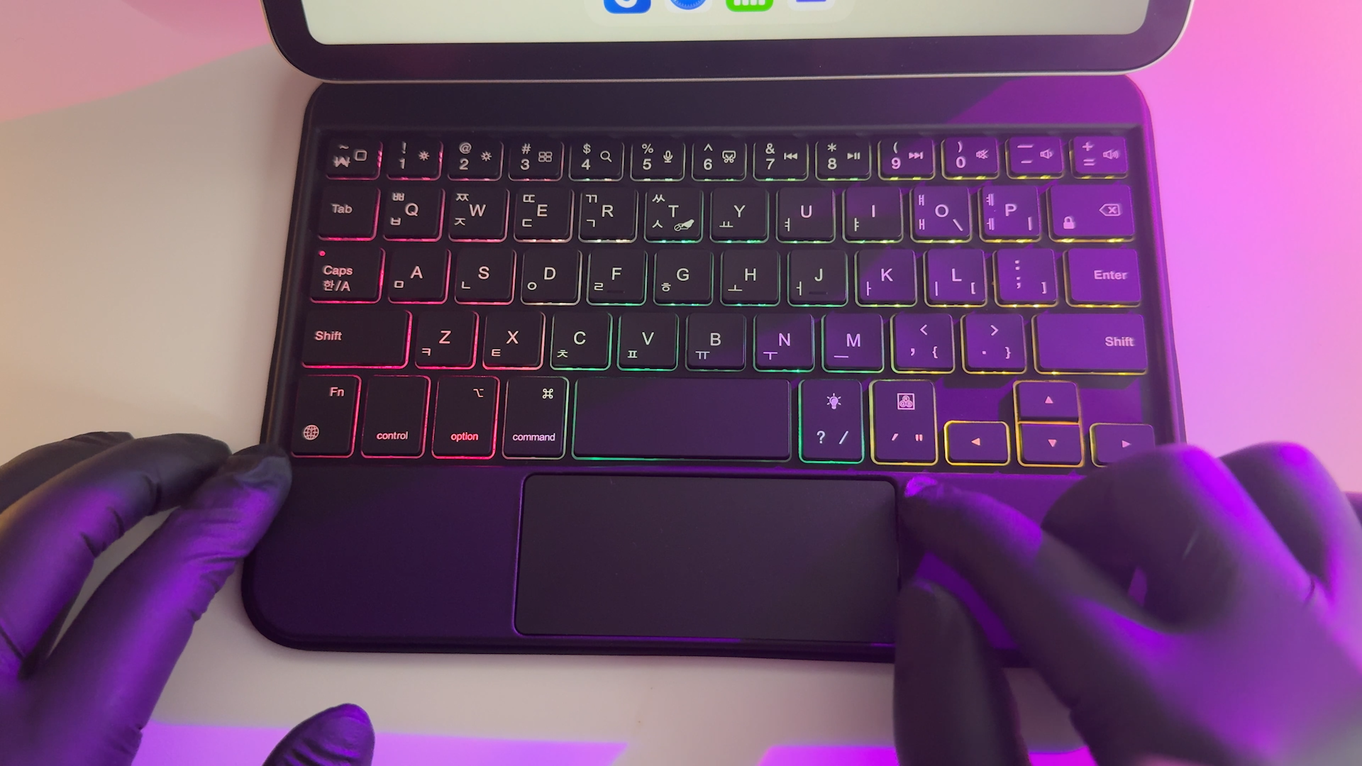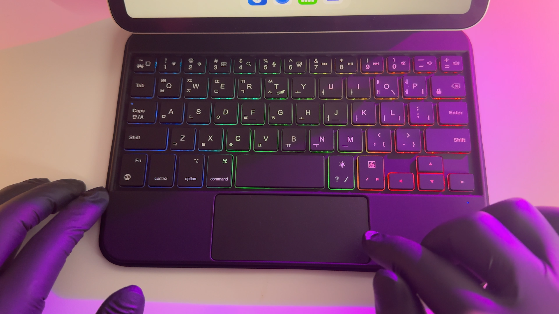 키보드는 블루투스 5.2 방식으로 페어링하면 사용할 수 있습니다. 포고핀 방식은 반드시 부착해서 사용해야 되지만 블루투스 방식은 탈착한 상태에서도 타이핑이 가능합니다. 펜타그래프 키보드를 사용하는데 키감은 맥북 보다는 가벼운 키감을 제공하는 것 같네요 일반적인 시중에서 판매하는 휴대용 블루투스 키보드와 동일합니다. 미니 사이즈라서 손이 큰 분은 사용하기 불편할 수도 있을 것 같습니다. 참고로 저는 평균적인 여성분들 손 크기 정도라서 여성분들이 사용하기에는 괜찮을 것 같습니다.