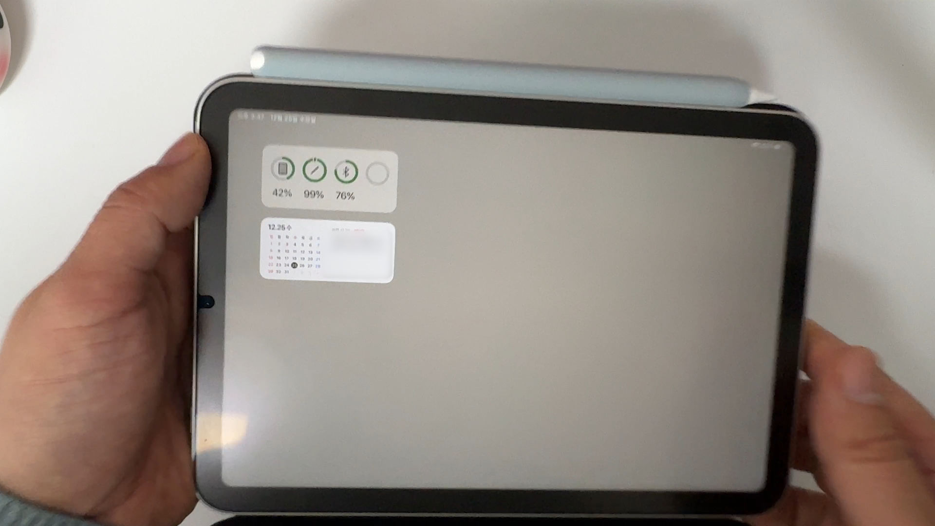 위쪽에 애플 펜슬을 부착할 수 있습니다. 배터리는 애플 펜슬 배터리 확인하는 것과 동일게 좌측에서 쓸어 넘기면 키보드 배터리 상태를 확인 가능합니다.