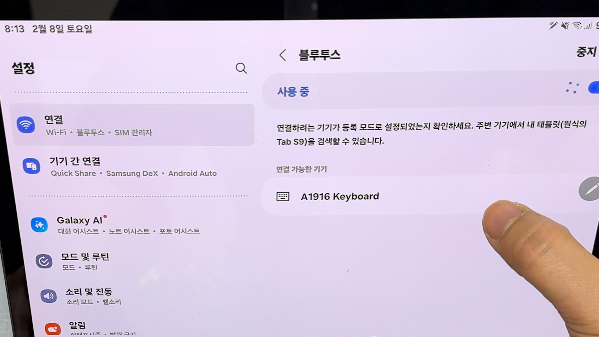 블루투스 연결로 가서 A1916 Keyboard를 선택하면 페어링이 완료됩니다.