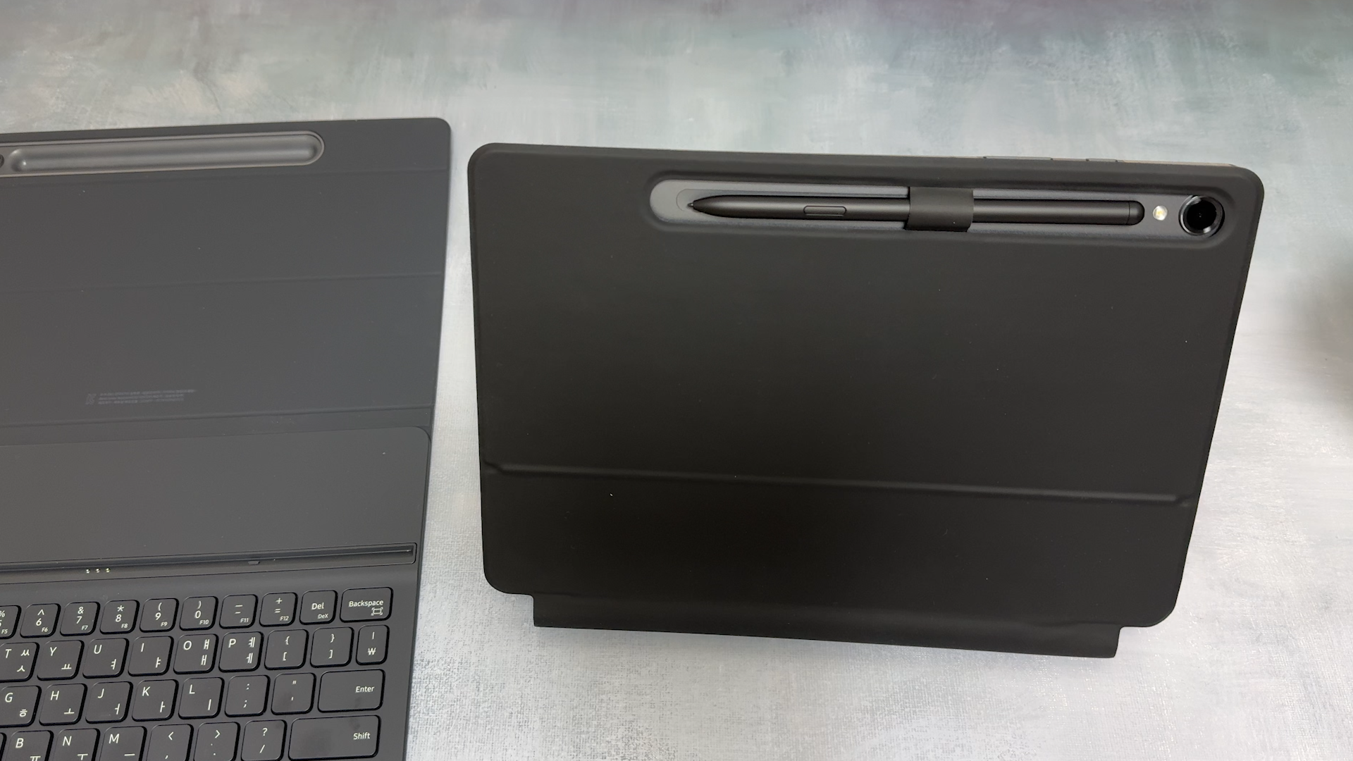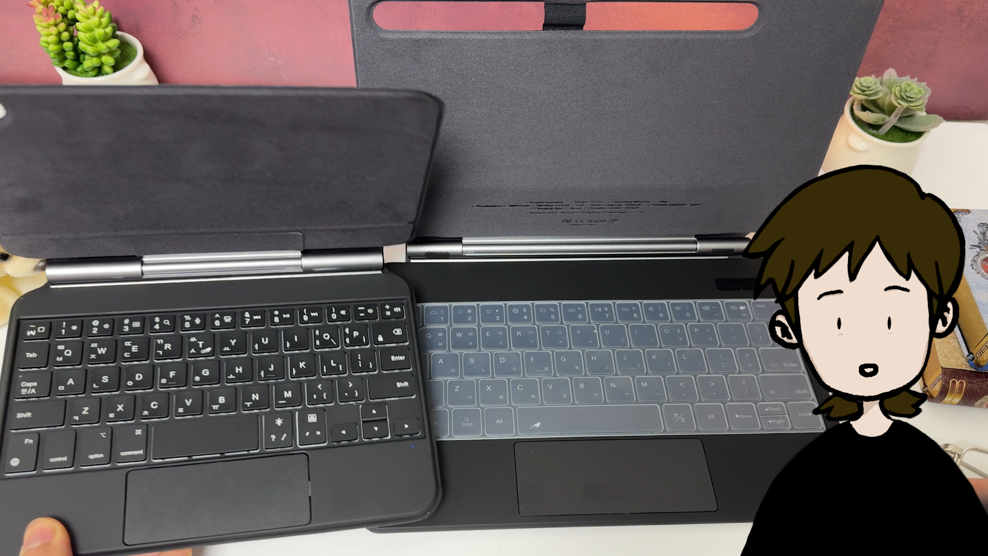 두 제품을 비교하면 앞쪽에서 보면 슬림 키보드가 펜 3개 정도 들어갈 공간 확보가 가능합니다. 대신에 뒤에서 보면 반대로 구조독 키보드가
