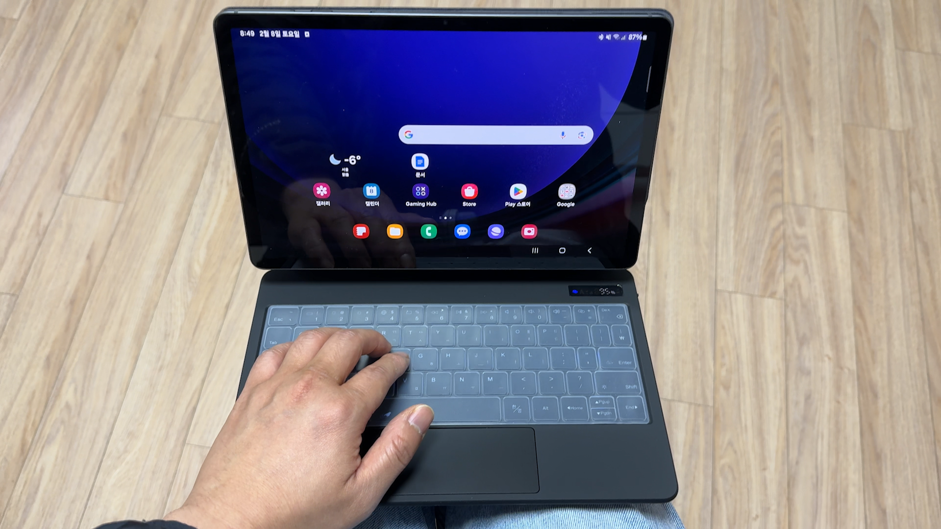 기본 노트앱에서 필기할 때, 첫 글자를 입력하면 자모음 분리 현상이 있습니다. 이건 스페이스바 눌러서 한 칸 띄어 놓고 작성하면 또 잘 됩니다. 원인은 모르겠는데 이 제품에 사용하라고 만든건 아니라서 넘어가겠습니다. 노트에서 타이핑 속도는 괜찮습니다.