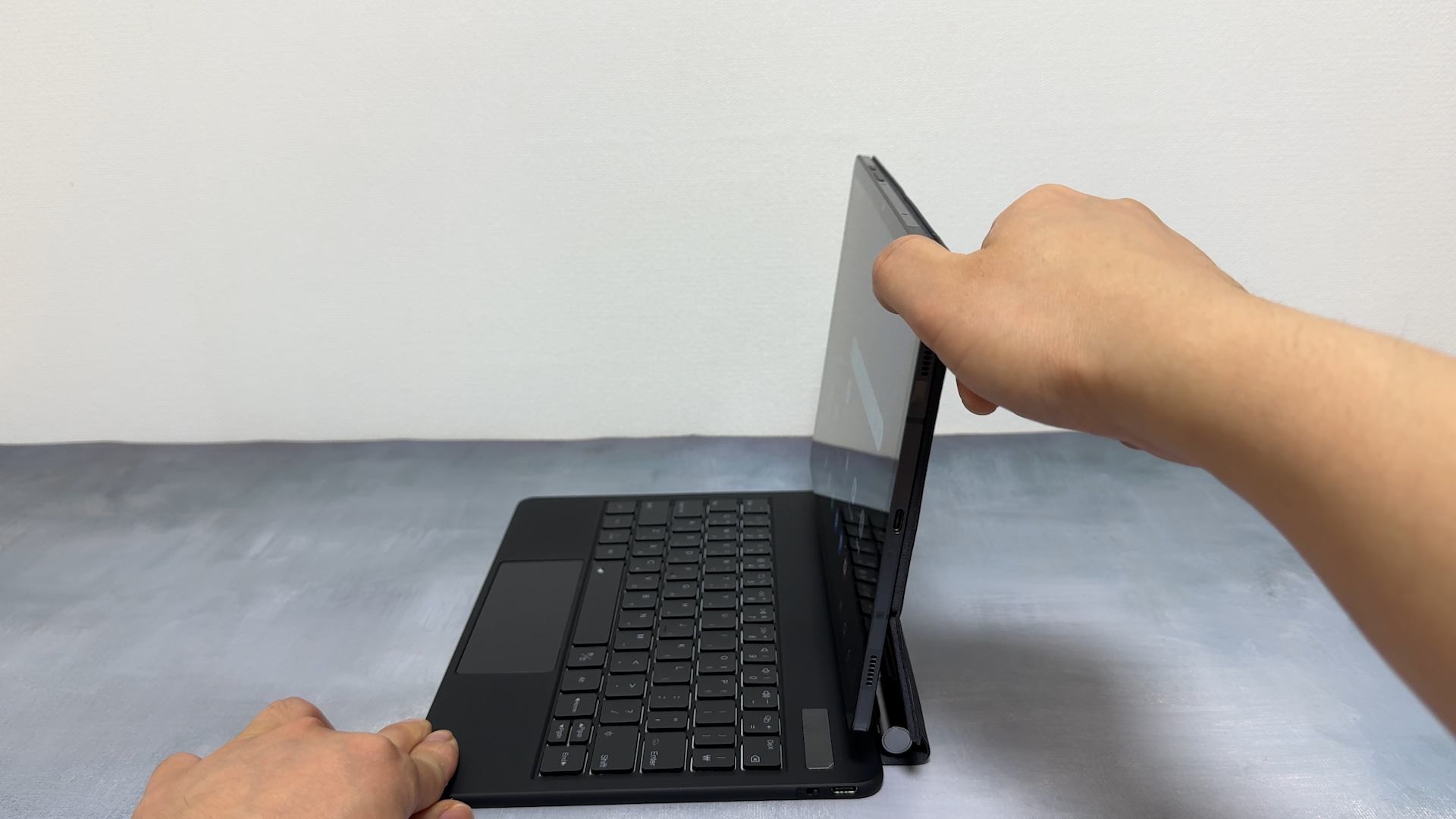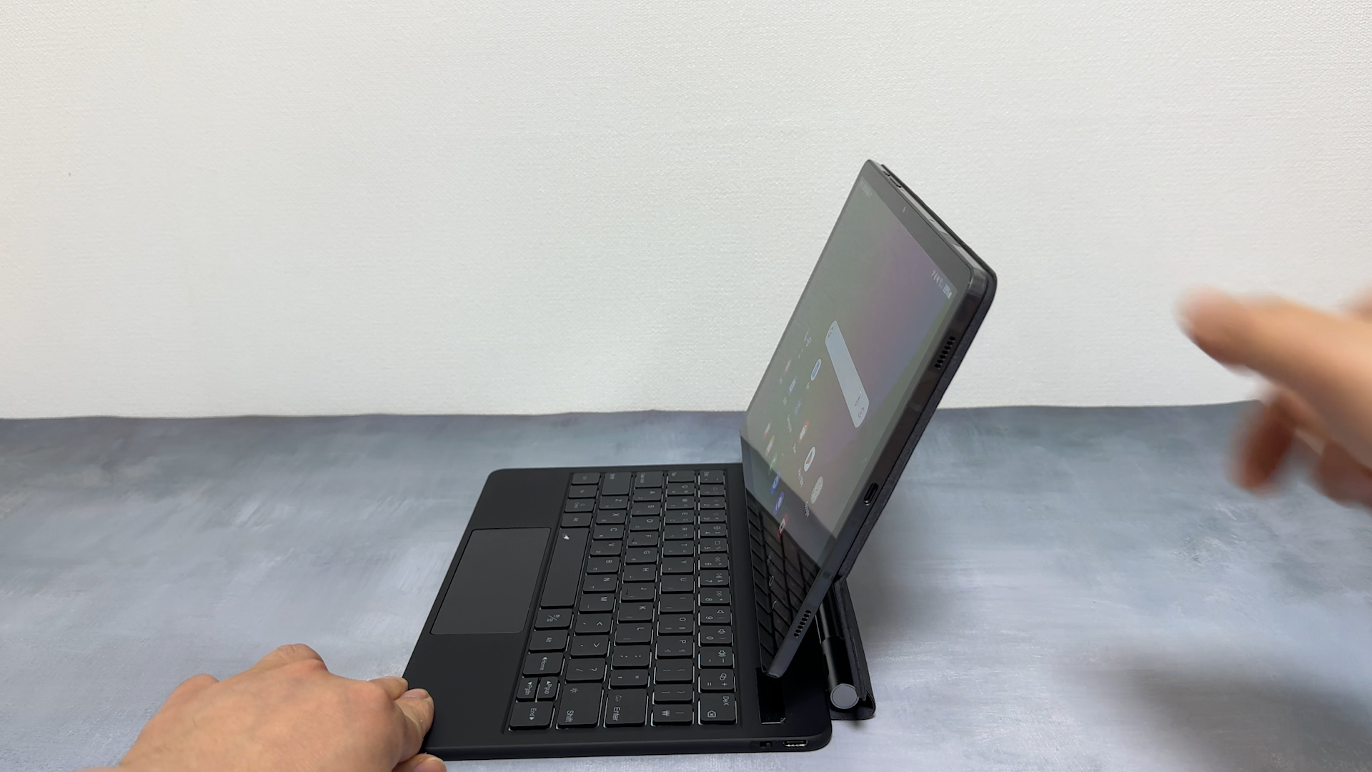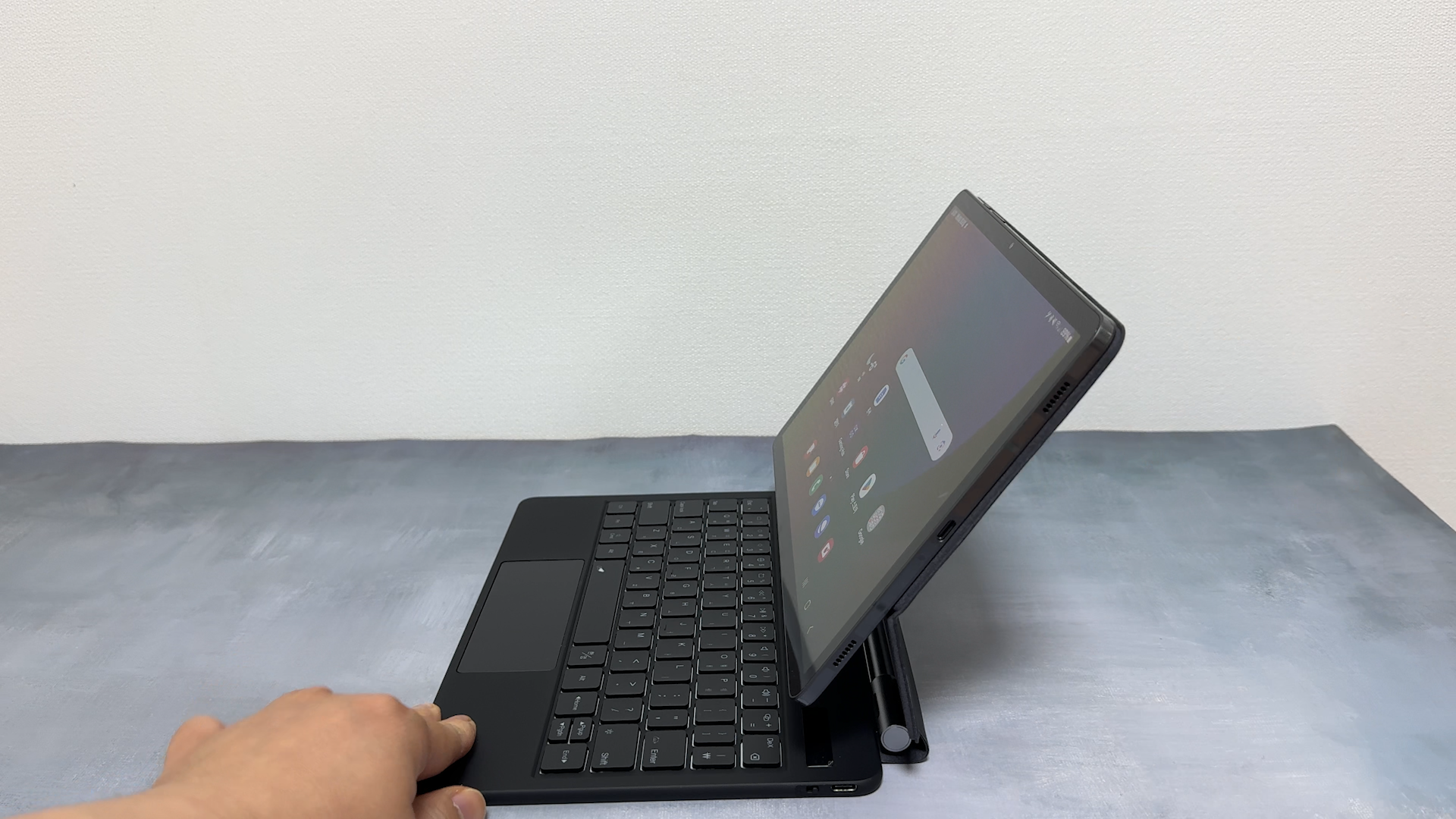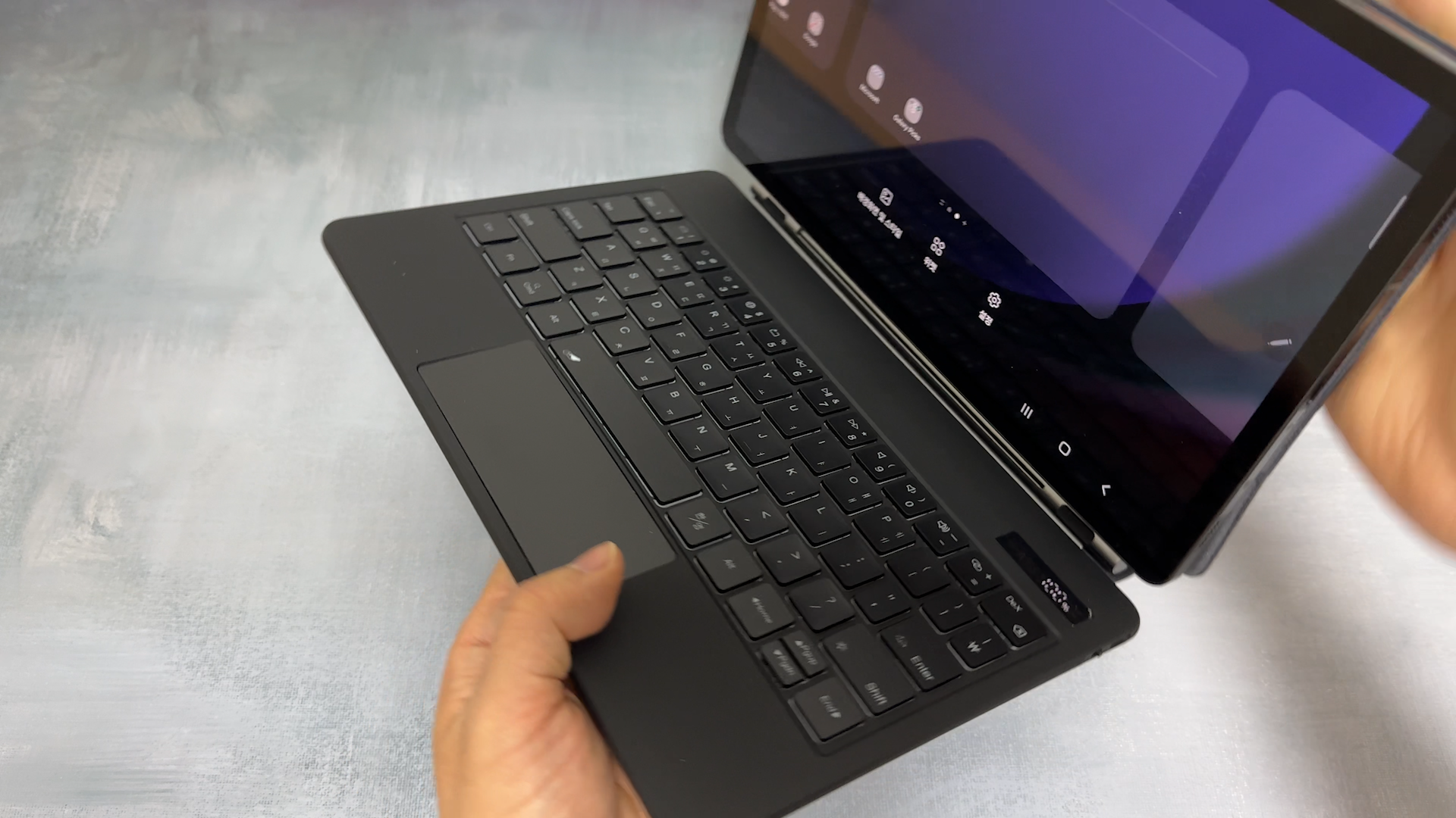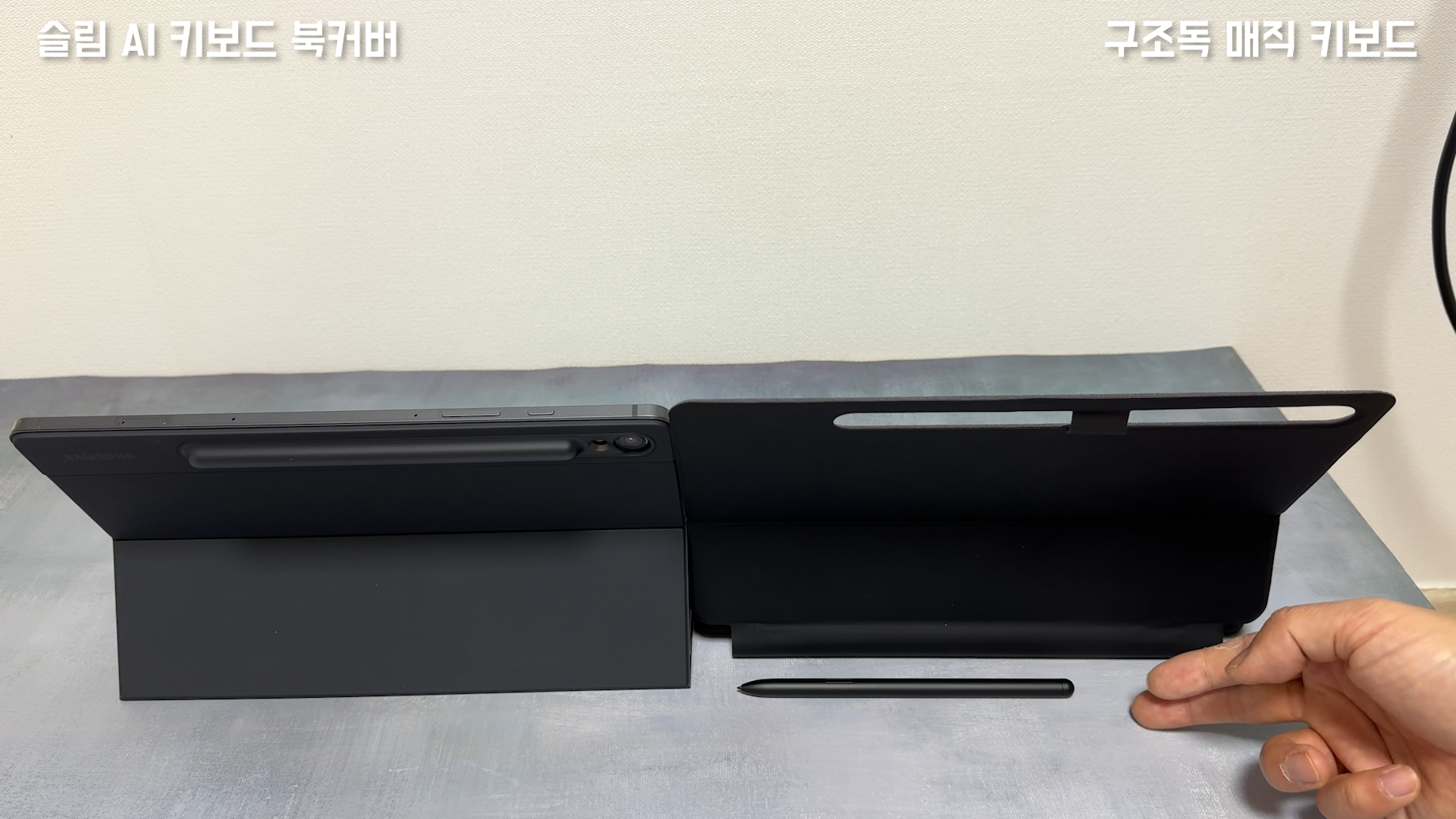 슬림 AI 키보드 북커버는 태블릿을 부착하면 거치하는 방식때문에 터치패드를 넣을 공간이 없습니다. 구조독 디자인은 아이패드 정품 매직 키보드 디자인을 많이 참고해서 만든 것 같습니다. 갤럭시탭 S9 정품 슬림 AI 키보드 북커버를 사용하고 있는데요 이 키보드는 슬림한 두께를 유지하는 것에 더 신경을 많이써서 키감이 좋지는 않습니다. 반면에 구조독 매직 키보드는 더 좋은 키감을 느낄 수 있습니다. 슬림 AI 키보드 북커버는 태블릿을 부착하면 거치하는 방식때문에 터치패드를 넣을 공간이 없습니다.