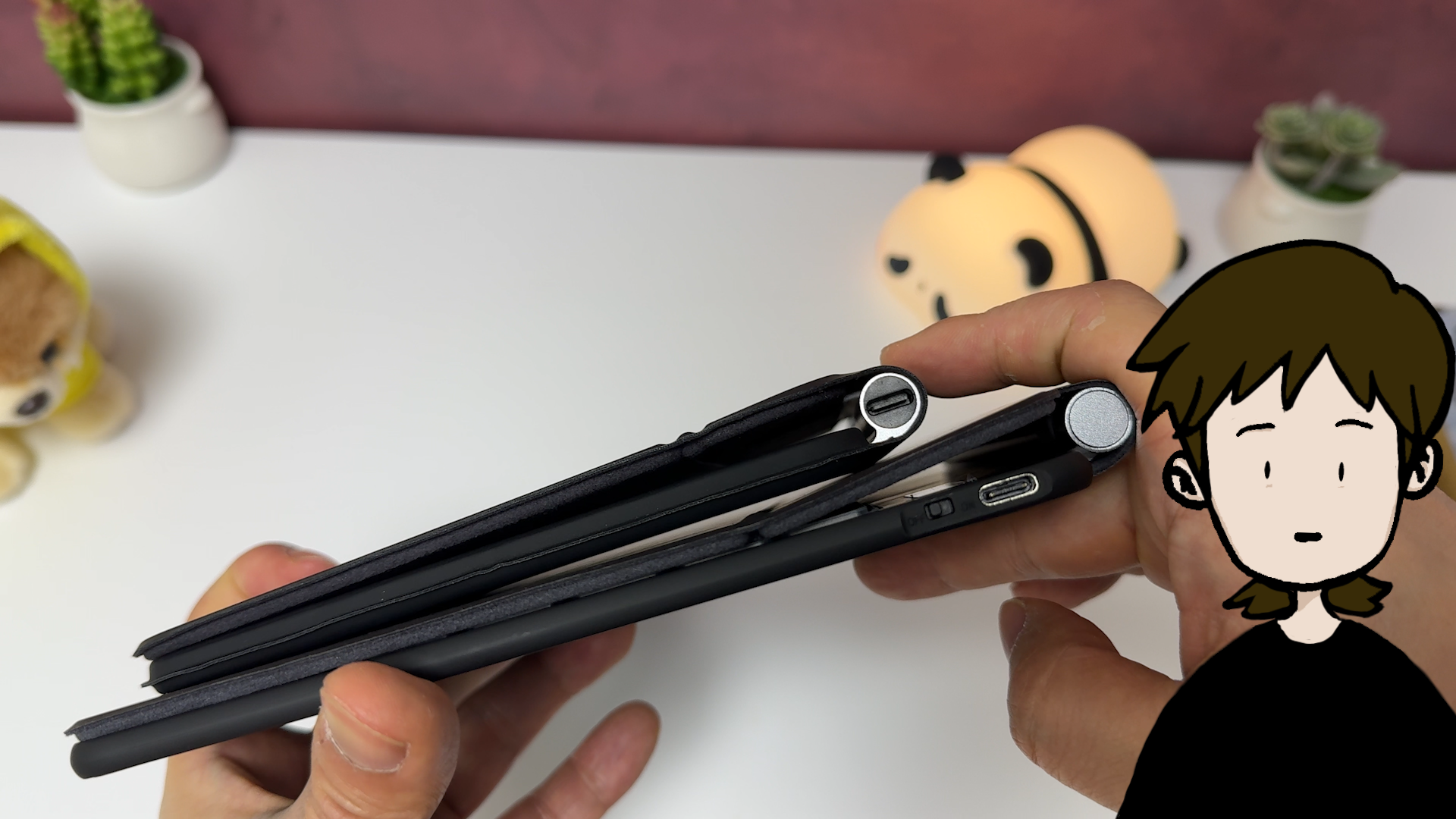 펜 3개 들어갈 정도의 공간이 있다는 것을 알 수 있습니다. 슬림 키보드는 더 적은 공간을 차지하는 건 맞지만, 구조독 키보드 제품도 자리를 많이 차지하지는 않습니다.