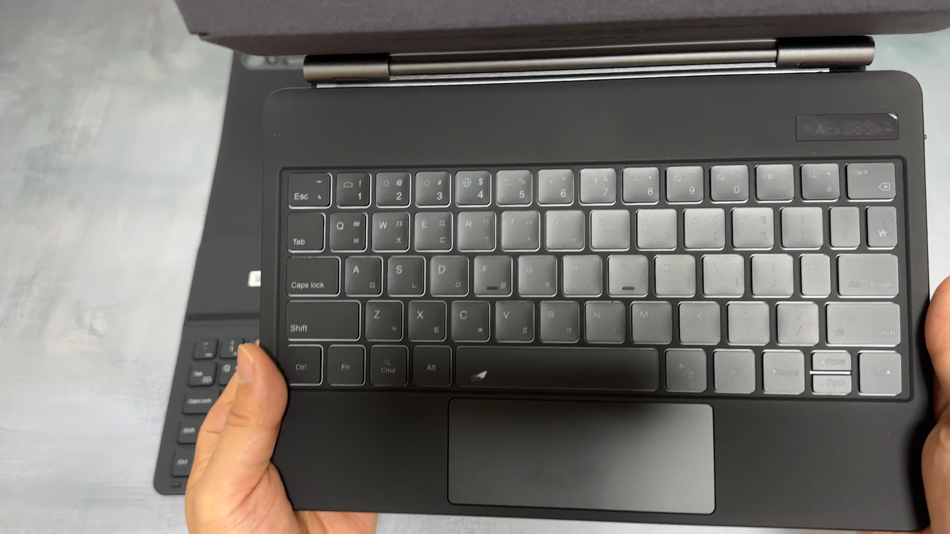 키보드를 열면 실리콘 키덮게를 동봉해 줬는데요 실리콘 케이스는 조용한 도서관에서 타이핑할때 소음을 줄여주는 역할을 합니다. 저는 계속 부착하고 사용하려고 해요 크기를 비교하면 8인치 제품과 11인치 제품의 크기 차이가 상당합니다. 키보드 느낌도 미니 7용은 조금 저렴한 블루투스 키보드 느낌이라면 11인치 제품의 키보드는 조금 더 고급스러운 키감이 느껴집니다. 단순히 키캡 크기 차이 외에도 타이핑 느낌이 많이 다릅니다. 터치패드 사이즈도 11인치 제품이 더 큽니다. 미니 용 제품도 11인치 제품 정도의 키감이었으면 좋았을 것 같네요 제품 각도 조절은 두 제품 모두 동일합니다.