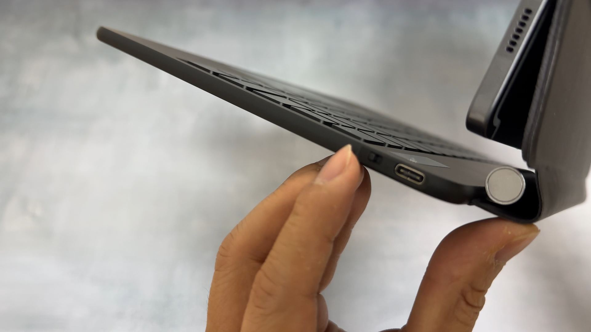 얼마전에 아이패드 미니 7 구조독 매직 키보드 리뷰를 진행했는데요 반응이 좋았는지 업체로부터 추가로 갤럭시탭S9 구조독 매직 키보드 제품을 받았습니다. 아이패드 미니 7 용은 힌지에 USB-C 충전 포트만 있고 덮게를 열면 자동으로 전원이 켜집니다. 갤럭시탭S9 구조독 매직 키보드 제품은 충전 포트 옆에 전원 버튼이 별도로 있습니다. 물리적 전원 버튼은 사용중에 이 버튼이 망가졌다는 분도 있어서, 전원을 켤때 조심히 사용해야 되겠네요