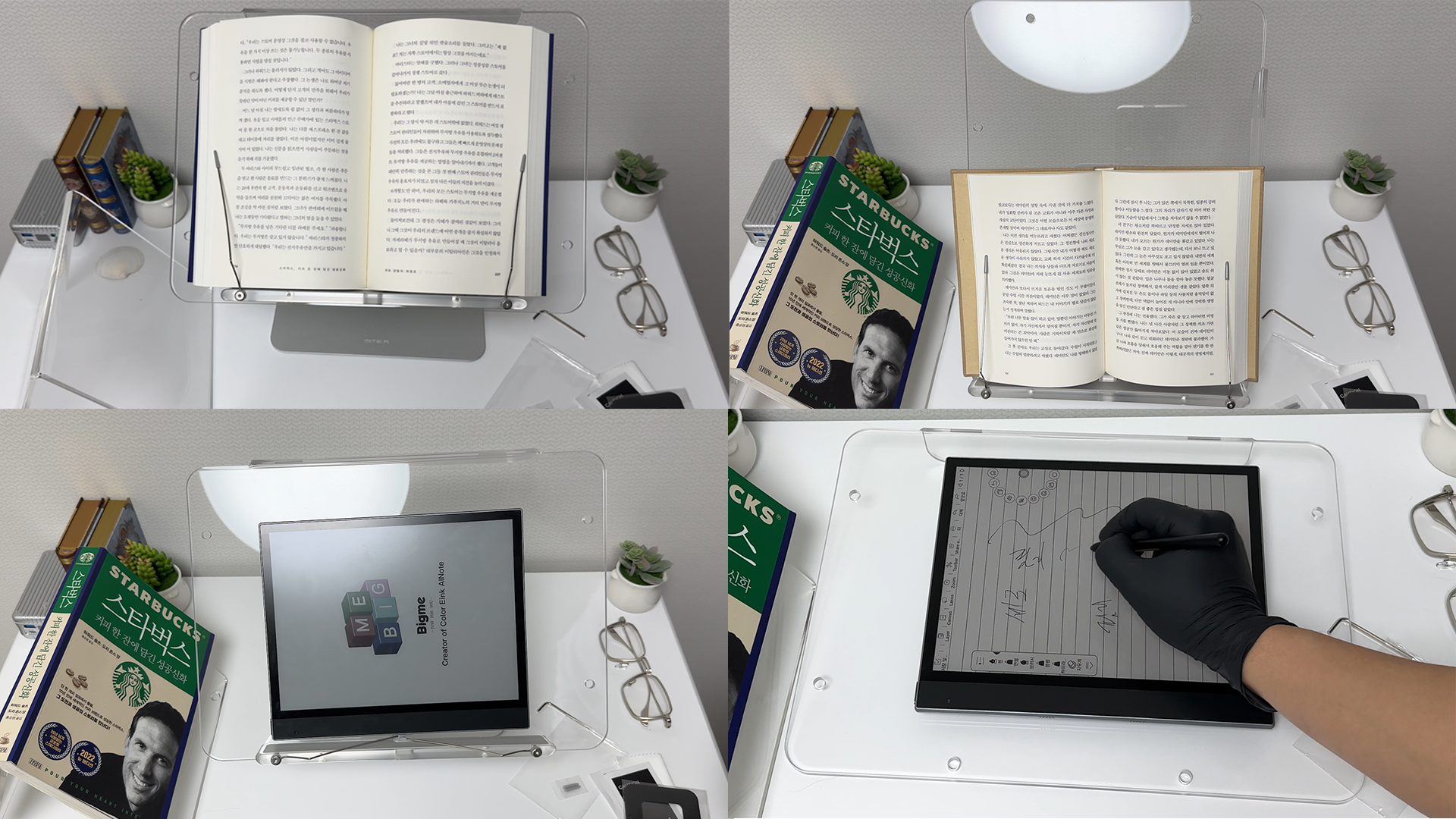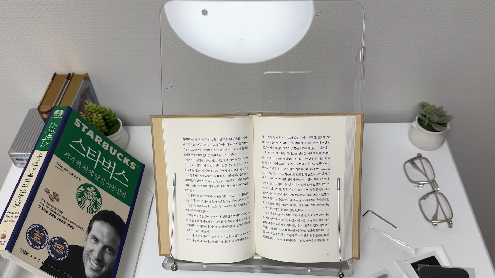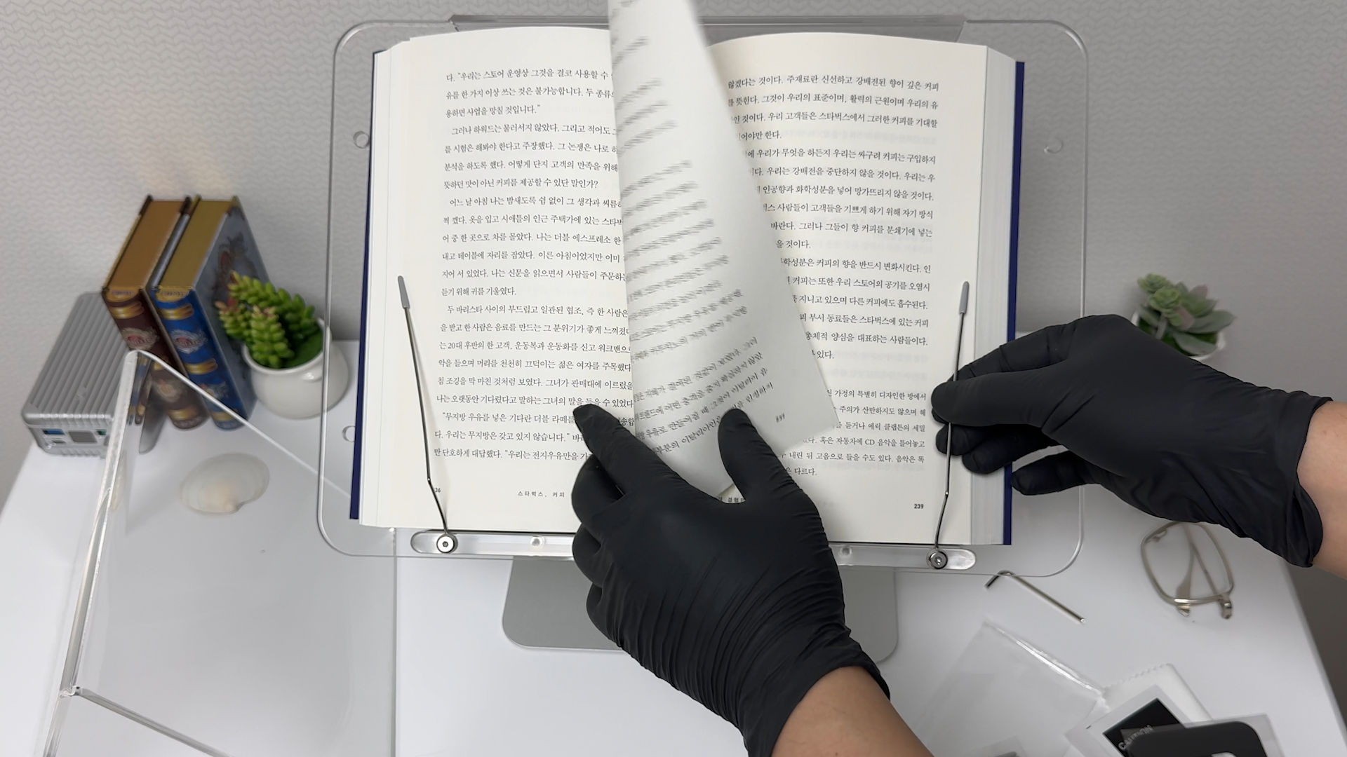 책을 하나 가져와서 실제 사용하는 모습을 보여드릴게요 거치대가 투명이라서 책에 더 집중이 되는 것 같습니다. 책장을 넘길때는 Book clip을 살짝 벌려주면 됩니다.