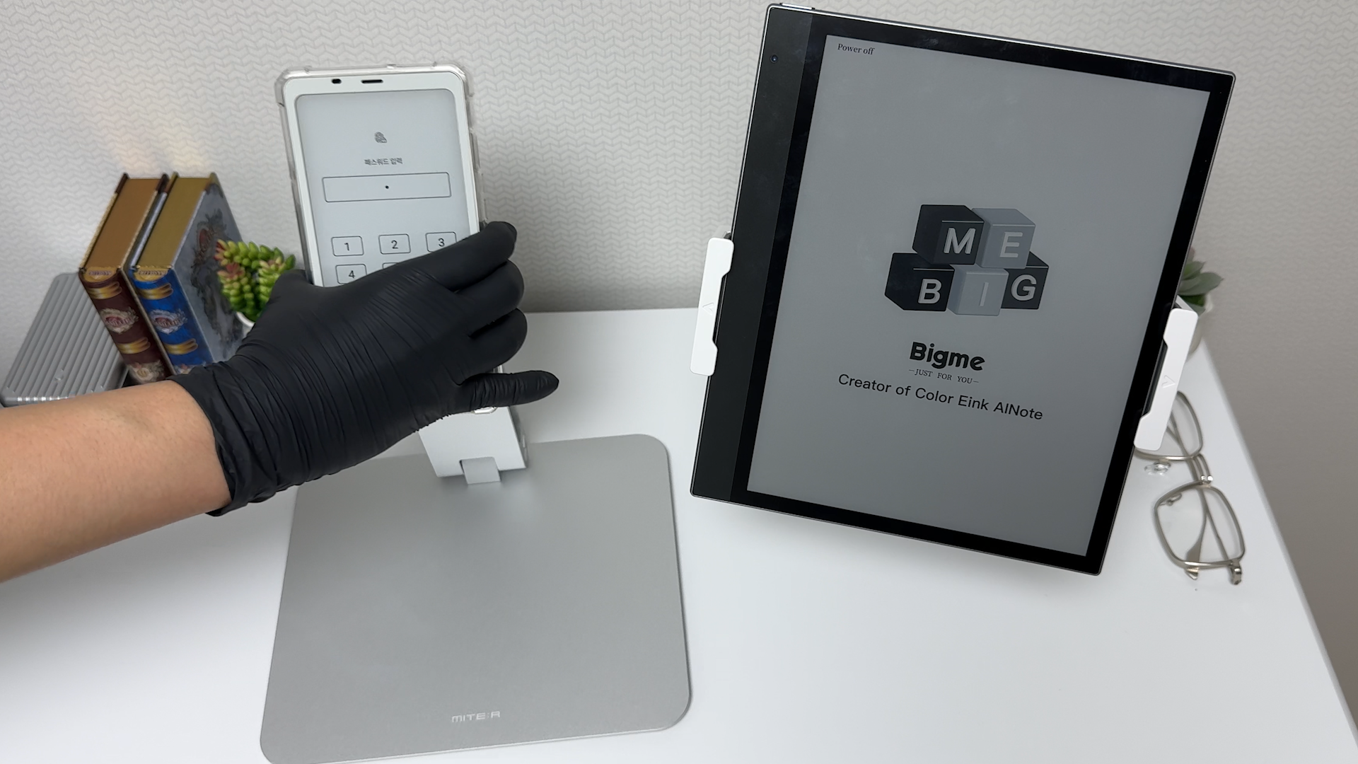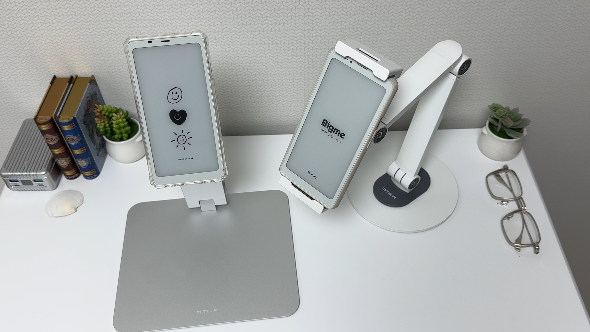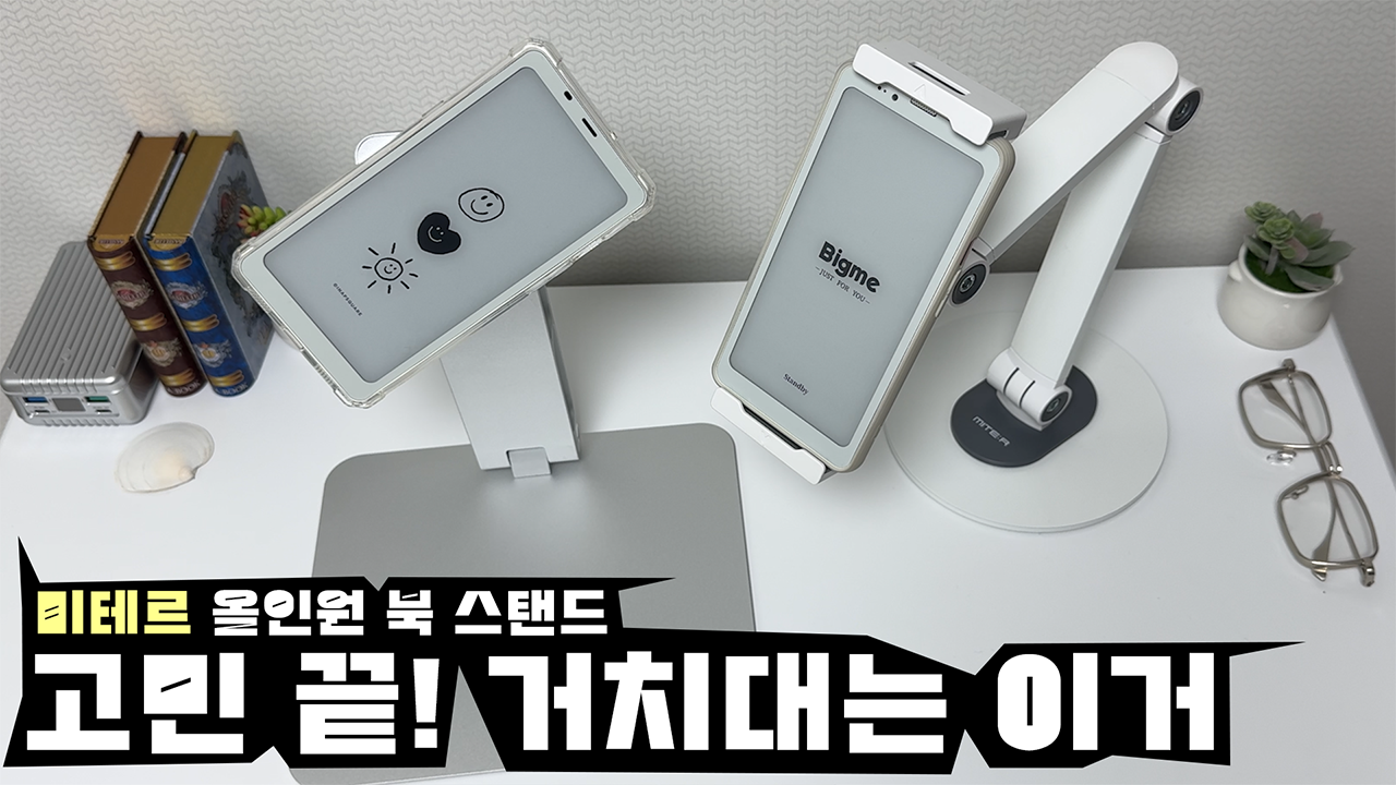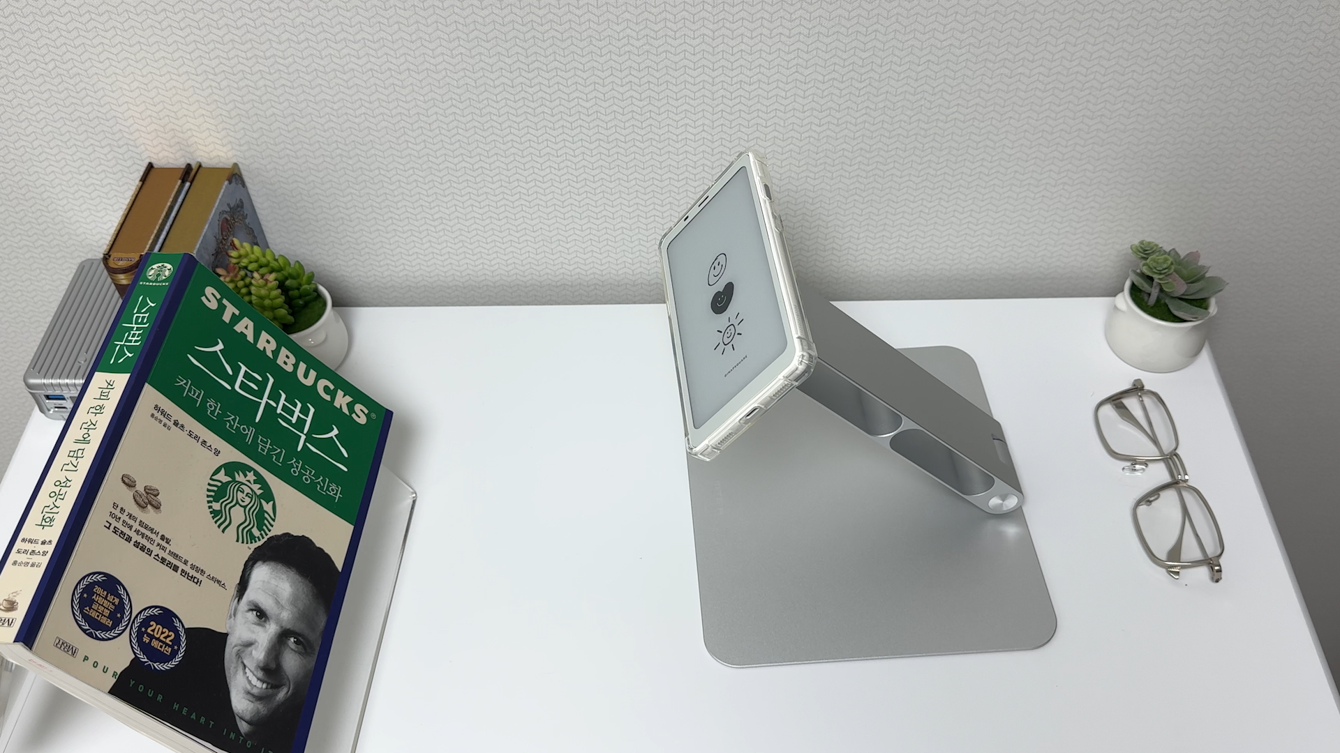그리고 마그네틱 미니 거치대에는 Bigme Hibreak PRO 제품을 거치해보겠습니다. 여러분은 두 제품 중에 어떤 게 디자인이 더 예뻐 보이시나요? 저는 각도 조절은 미니 거치대가 더 편한 것 같고요 디자인은 마그네틱 북 스탠드가 더 예뻐 보이네요