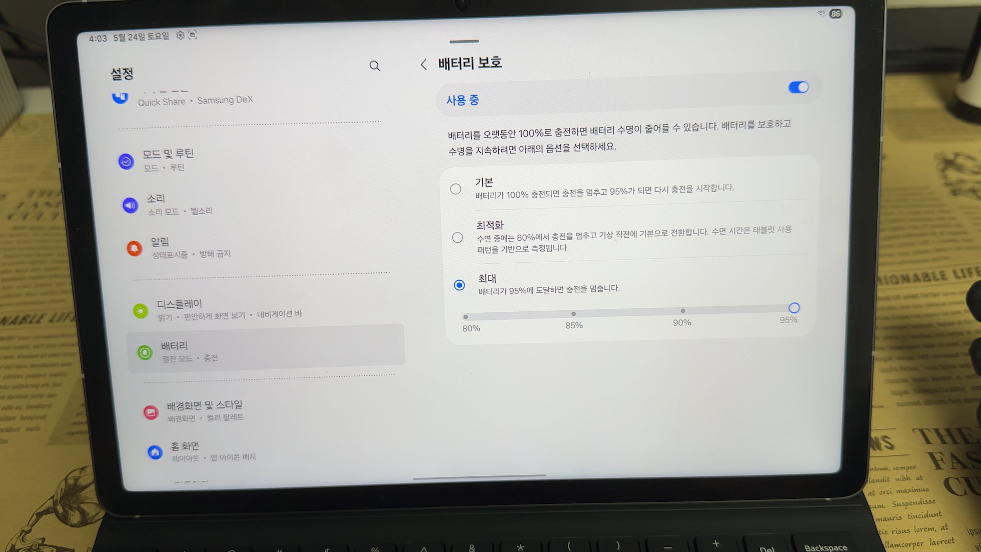 그리고, ‘배터리 보호’ 기능도 꼭 켜두세요 이 기능을 활성화하면 배터리가 95%까지만 충전되어 장기적으로 배터리 수명을 훨씬 더 오래 유지할 수 있습니다. 특히 집이나 사무실에서 항상 충전기에 꽂아두고 쓰는 분들에게 강력 추천드려요