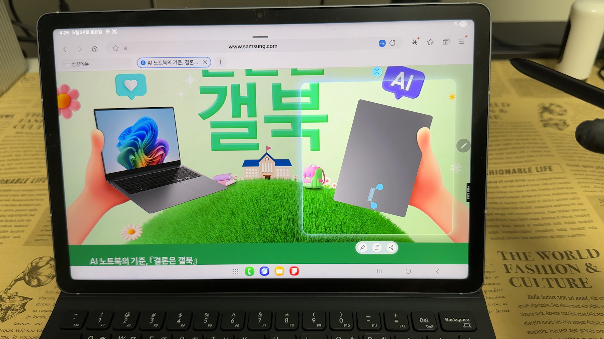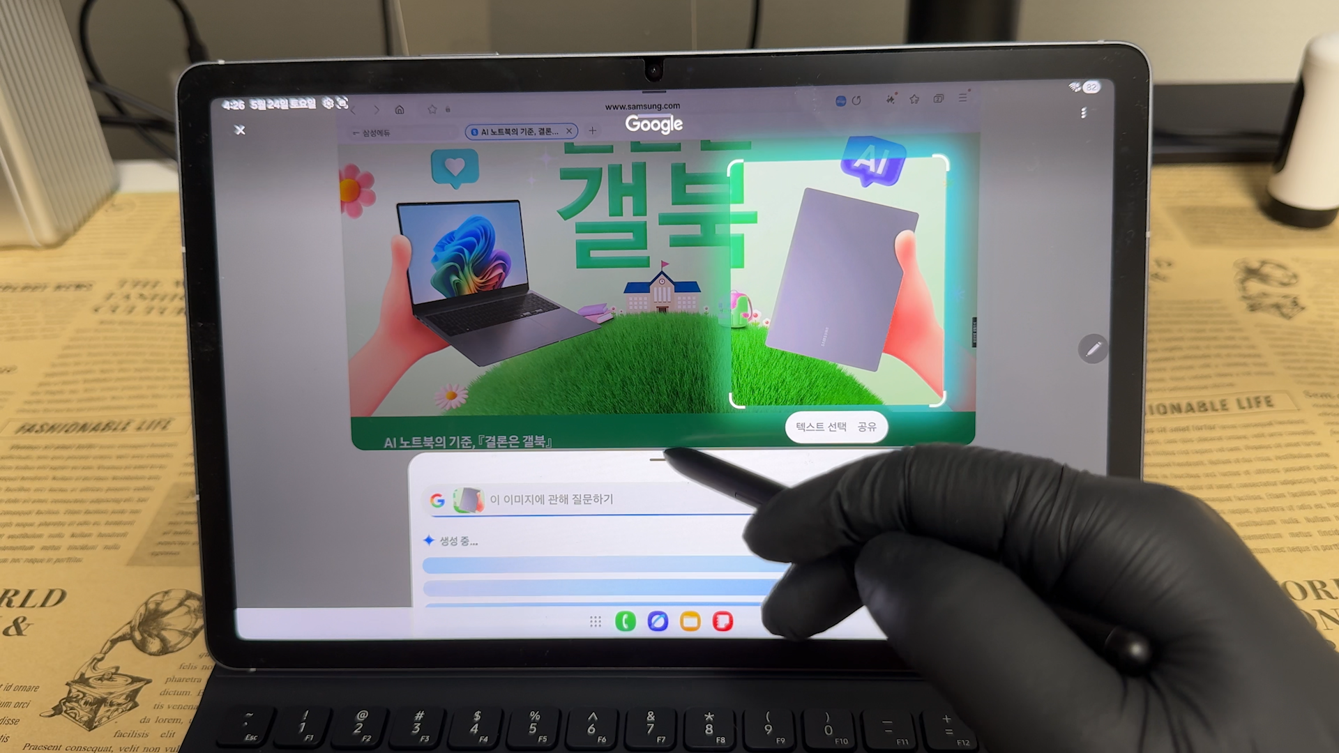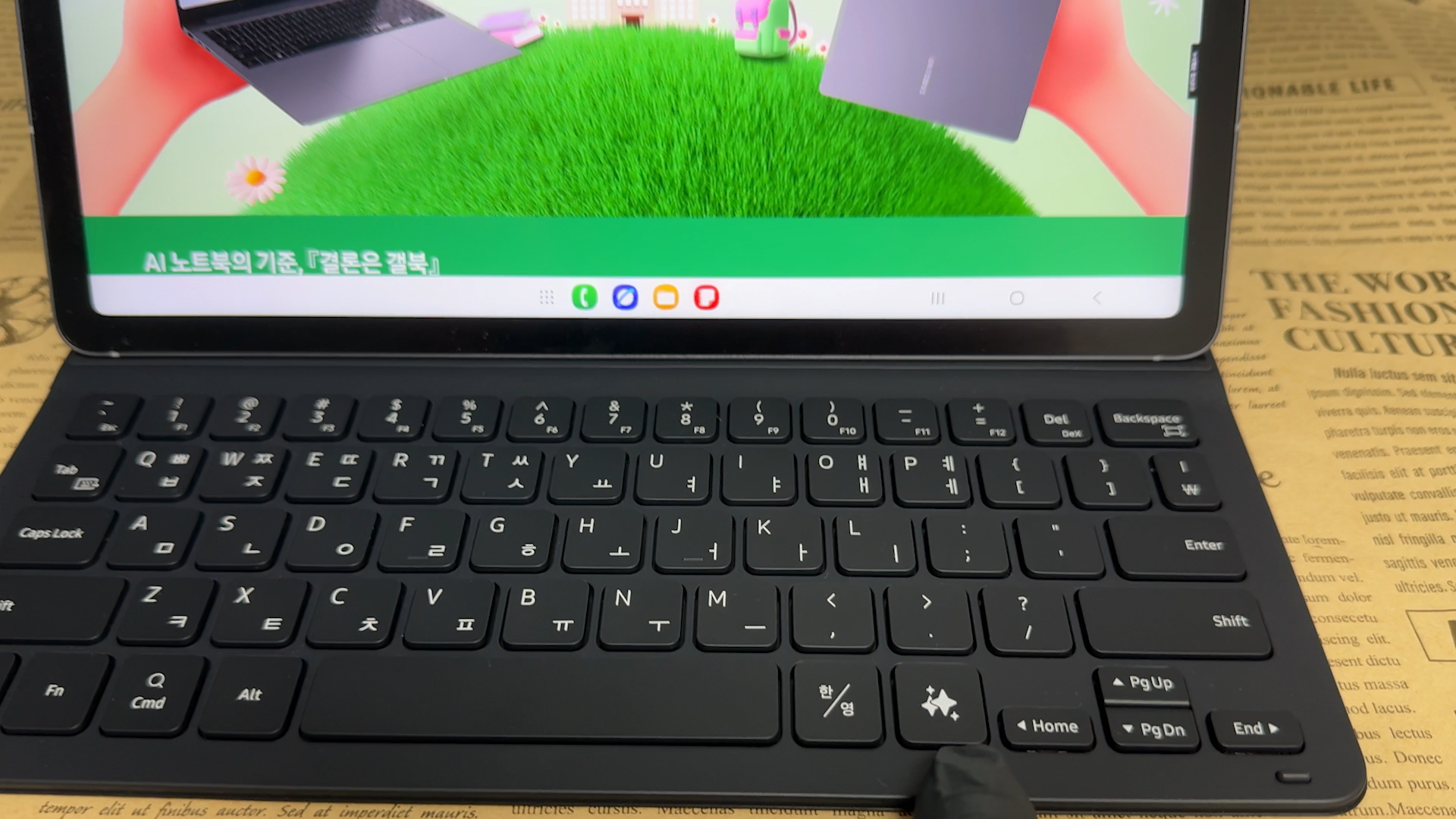 키보드 키감은 삼성 제품들은 모두 동일합니다. 문서 작업만 한다면 노트북 보다는 휴대성이 좋은 태블릿을 추천드립니다. 공간도 많이 차지하지 않아서 협소한 테이블에서도 사용할 수 있습니다. 전용 AI 키보드 북커버를 사용해서 생산성 작업도 충분히 가능합니다. AI 버튼만 눌러주면 Gemini를 호출해서 AI 기능을 사용할 수 있습니다.
