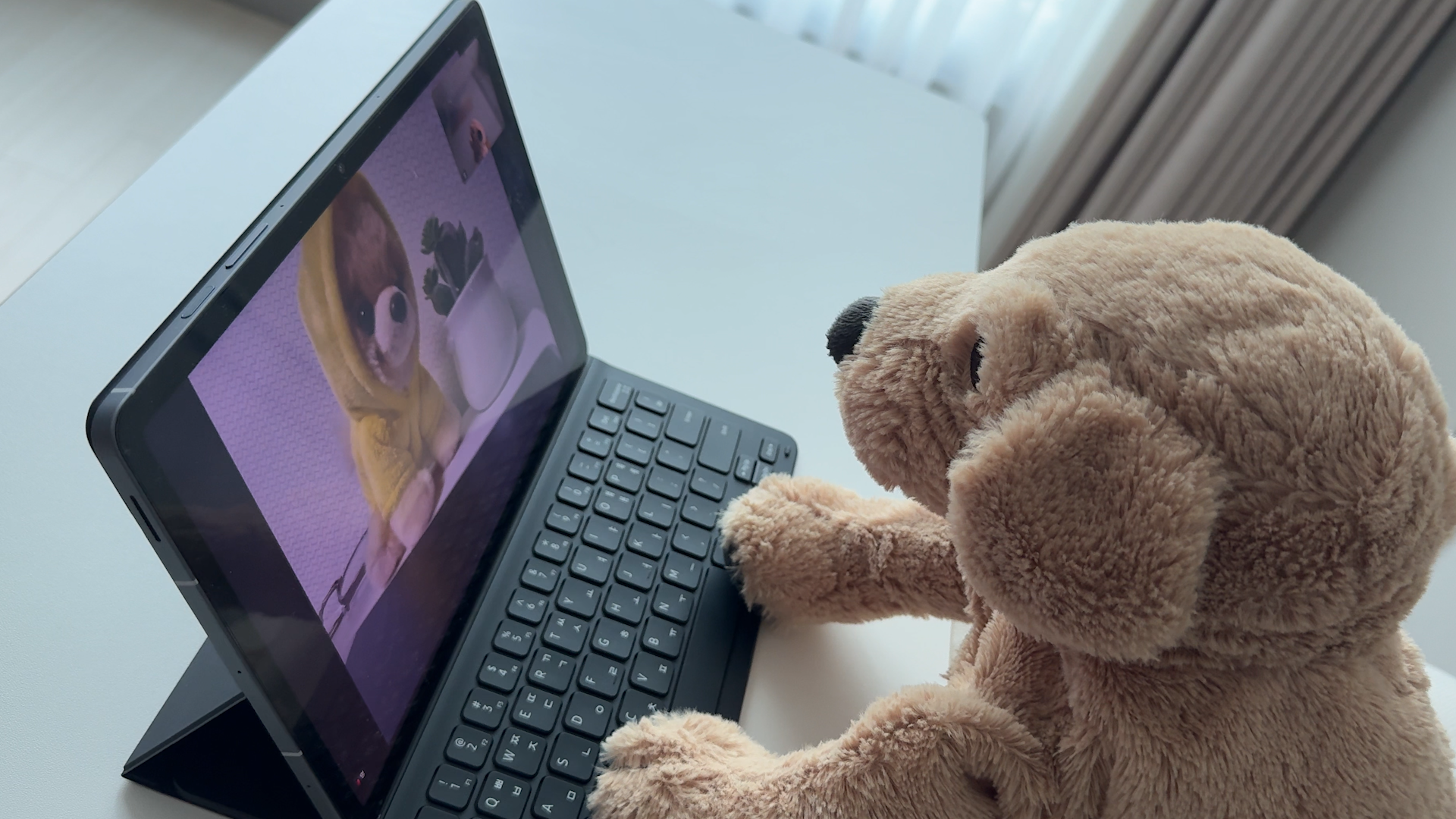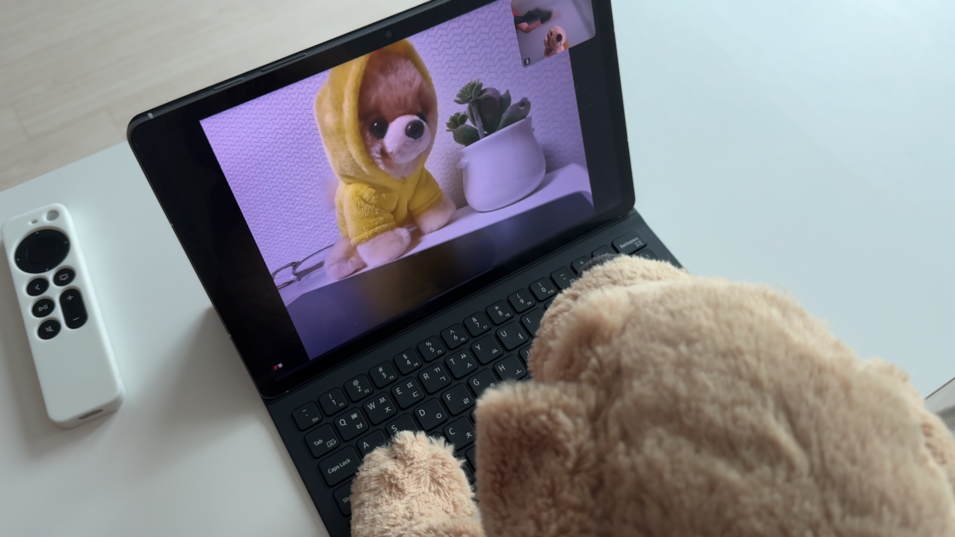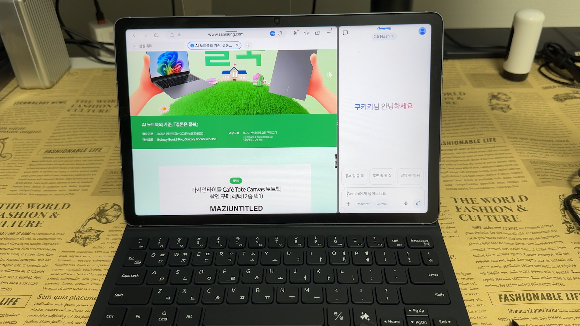키보드 키감은 삼성 제품들은 모두 동일합니다. 문서 작업만 한다면 노트북 보다는 휴대성이 좋은 태블릿을 추천드립니다. 공간도 많이 차지하지 않아서 협소한 테이블에서도 사용할 수 있습니다. 전용 AI 키보드 북커버를 사용해서 생산성 작업도 충분히 가능합니다. AI 버튼만 눌러주면 Gemini를 호출해서 AI 기능을 사용할 수 있습니다.