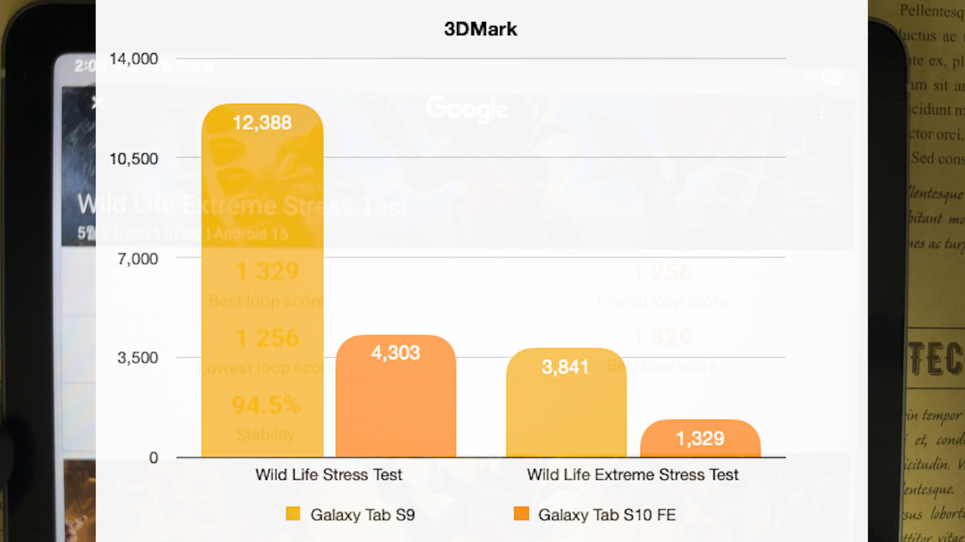 Wild Life Extreme Stress Test 1256점~1329점까지 안정성 94.5% 측정되었습니다.