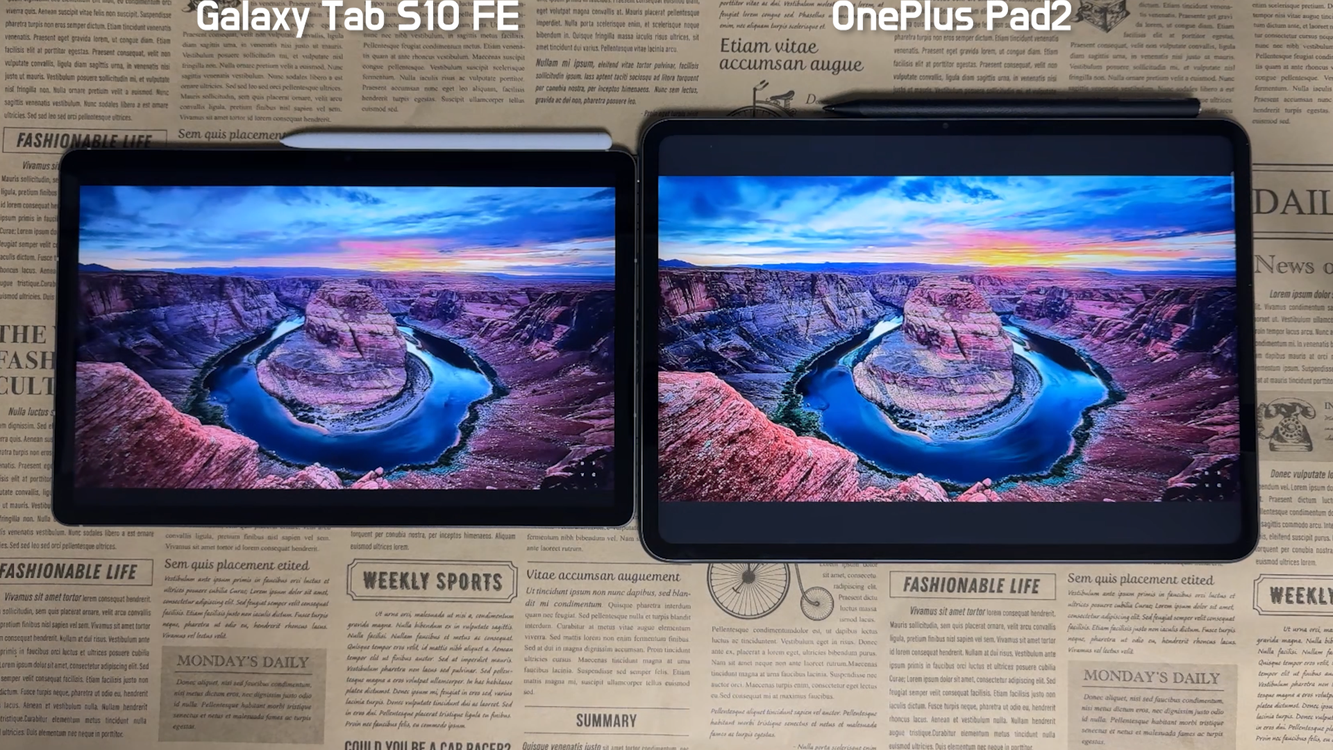 가로 영상을 봐도 역시 OnePlus Pad2 제품 레터박스가 더 많이 생깁니다. 화질은 OnePlus Pad2 제품이 더 화사해 보이고, 갤럭시 제품은 공통적으로 파란색을 과하게 표현해 주는 건 있습니다.