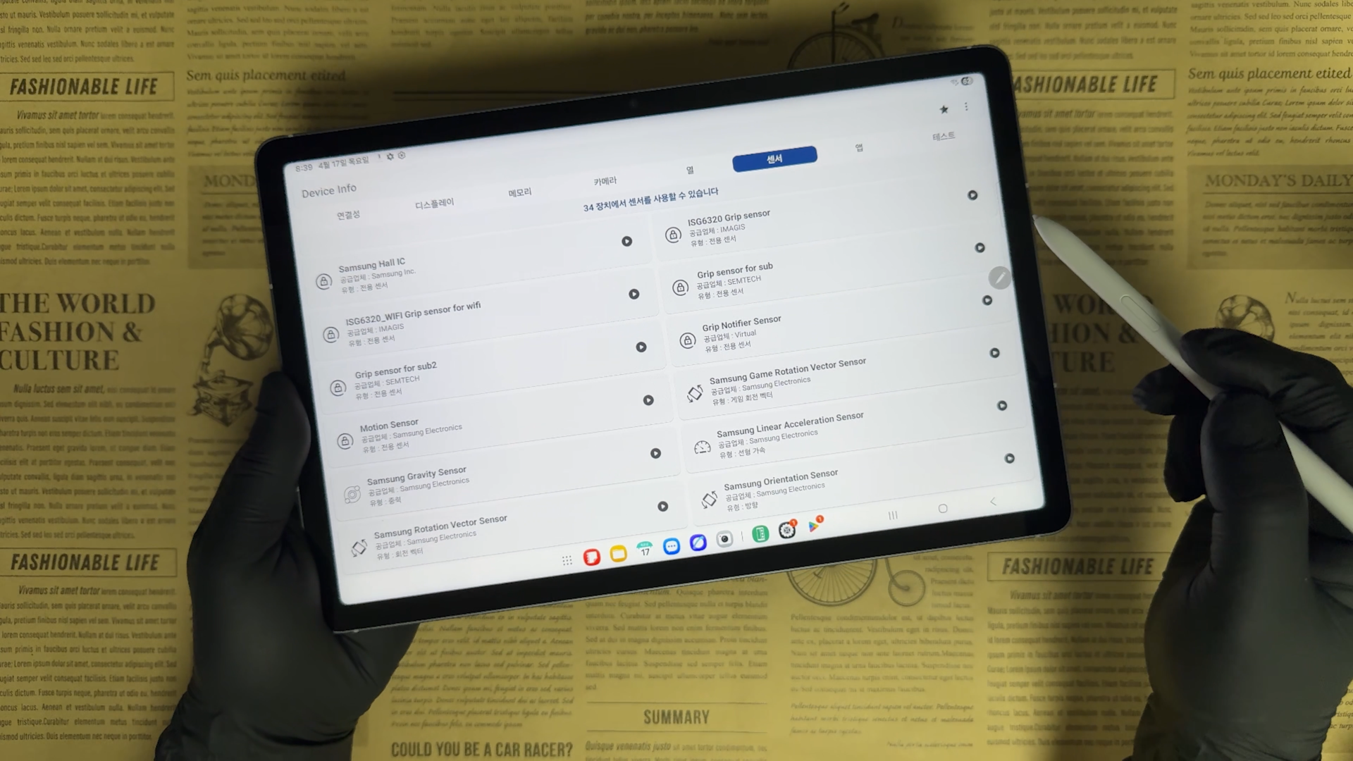 센서는 34개 탑재되어 있어서 GPS, 지자기 센서 모두 있습니다.