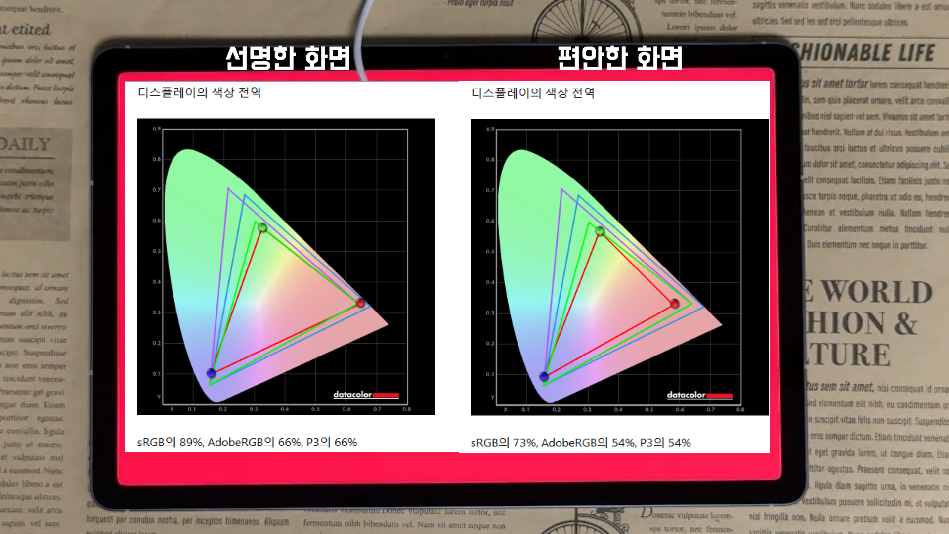 16:10 비율, 해상도 2304 x 1440 LCD 패널에 90Hz 주사율에 수동 밝기 600nits, 밝기 최적화로 야외에서 최대 800nits 지원하고 있습니다. 디스플레이이 측정 결과를 보면 화면 모드를 선명한 화면에서는 sRGB 89%, P3 66% 나오고, 편안한 화면에서는 sRGB 73%, P3 54% 측정이 되었습니다.