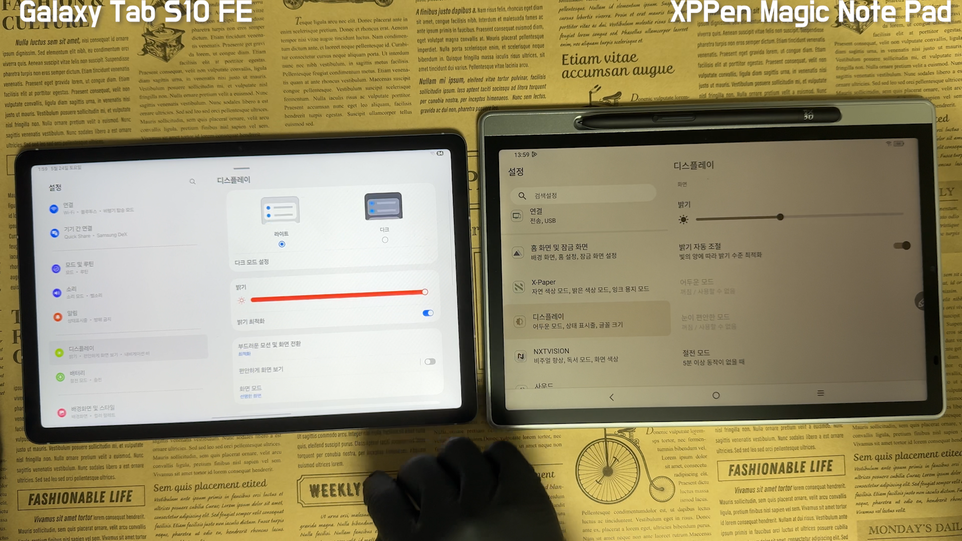 Magic Note Pad 리뷰 중에 센서가 오른쪽 하단에 있어서 자동 밝기를 켜놓으면 손바닥이 센서를 가려서 화면이 어두워 지는 단점이 있었습니다. 갤럭시탭 S10 FE 제품은 그런 단점을 언급도 못하게 자동 밝기 조절 기능이 없습니다. 단가를 낮춘 FE 제품의 한계인 것 같습니다. 대신에 화면 노크온 기능도 있어서 편리하게 탭을 사용할 수 있습니다.