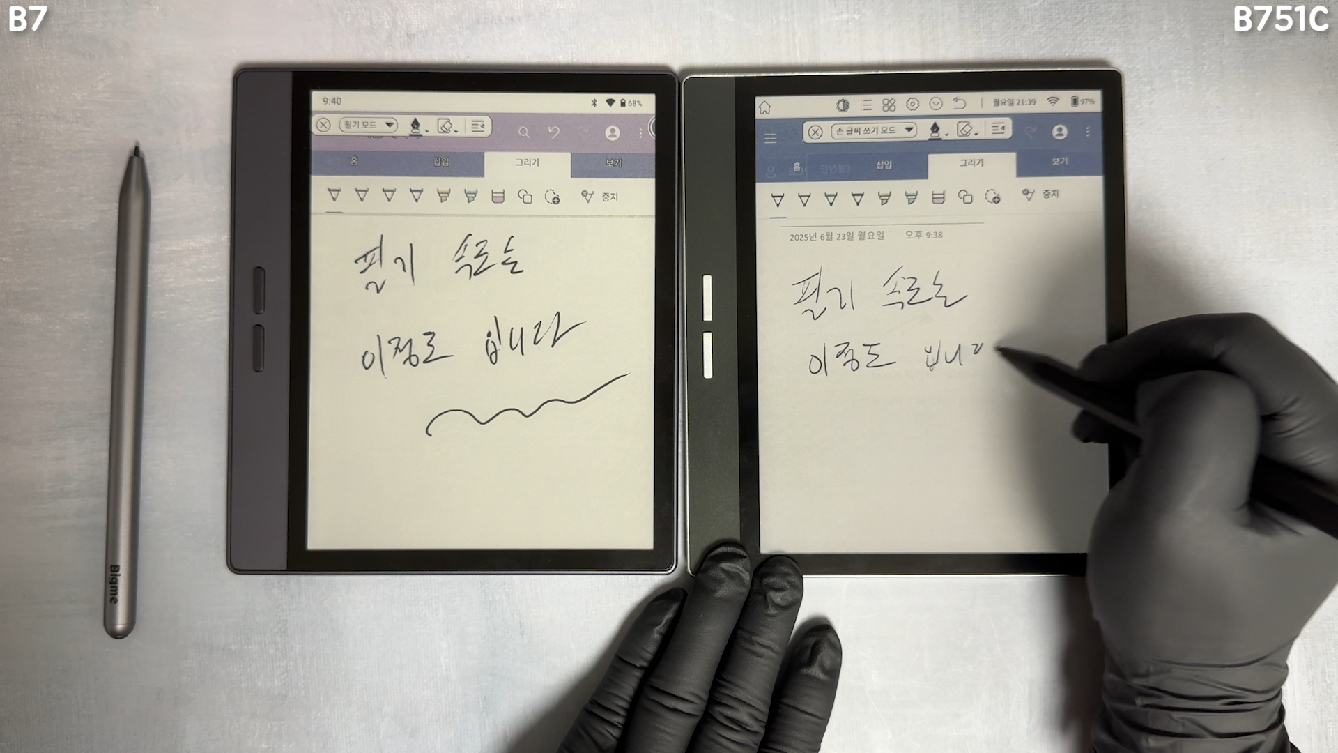 4096 단계 필압 인식 스타일러스는 기본 노트 앱 외에도 원노트에 최적화가 되어 있어서 지연없이 빠르게 필기를 할 수 있습니다. 필기 속도는 두 제품 큰 차이는 없습니다. 매트 디스플레이지만 사각 거리는 마찰감을 주지는 않습니다. 태블릿에 지문방지 필름을 부착한 느낌과 동일하다고 보면 됩니다. 종이 질감의 필기감을 원하는 분들은 아쉬울 수는 있을 것 같네요 필기할때 느낌은 B751C 펜보다는 B7 펜이 더 좋습니다.
