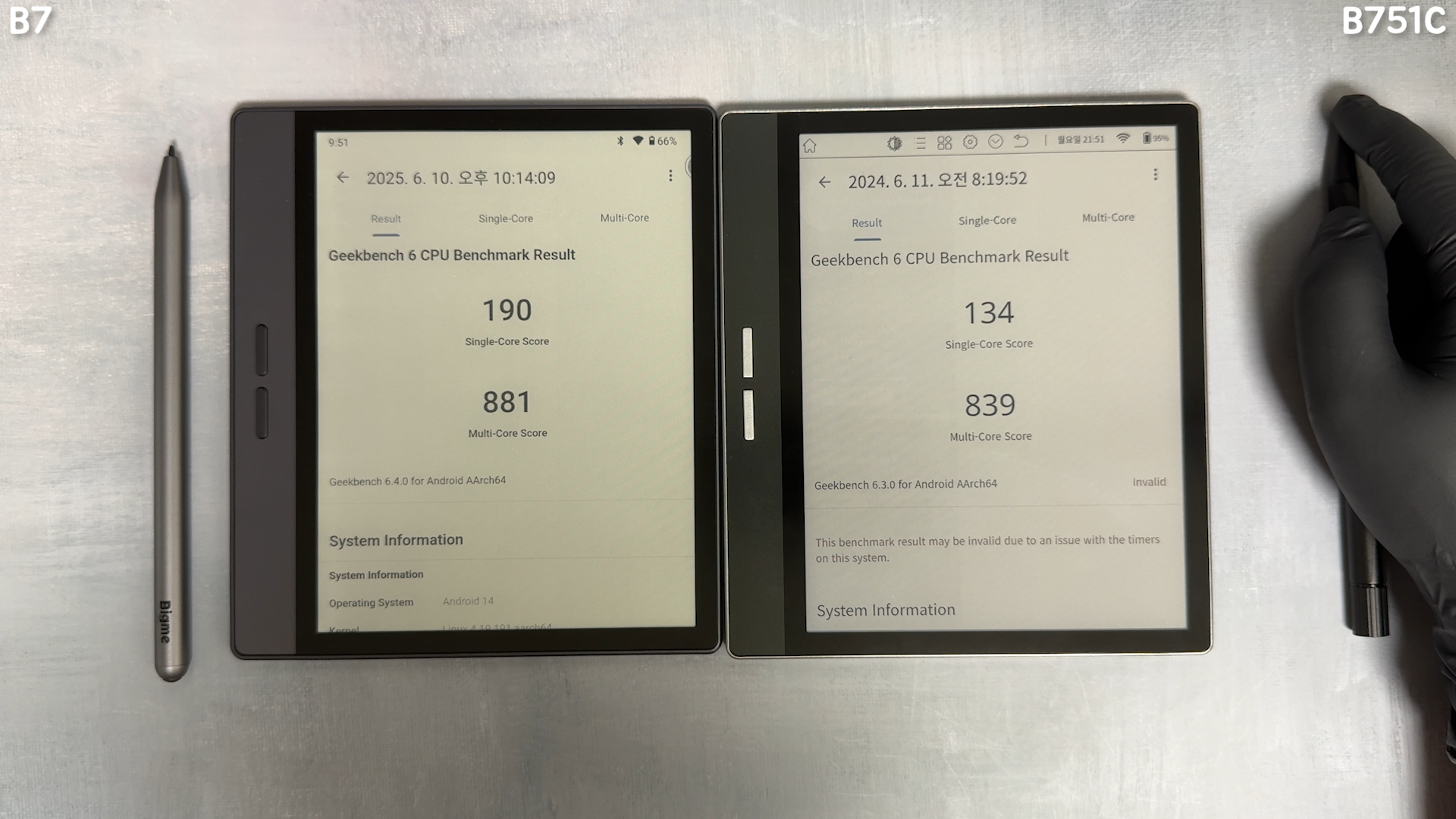 B7는 Android 14, B751C는 Android 11을 탑재했습니다. AP는 두 제품 동일하게 Helio P35, 8코어를 사용하고 있고, B7은 RAM 8GB, Storage 128GB로 B751C에 RAM 4GB, Storage 64GB 제품보다 성능이 높은 제품입니다. 성능 측정을 보여드리면 동일 AP이지만 RAM이 높은 B7 제품이 조금 더 높게 측정이 되었습니다. 긱벤치 6에서 싱글 190점, 멀티 881점으로 나옵니다. 일반 태블릿보다는 반응 속도가 느리지만, e잉크 기기 중에서는 쾌적한 편입니다.